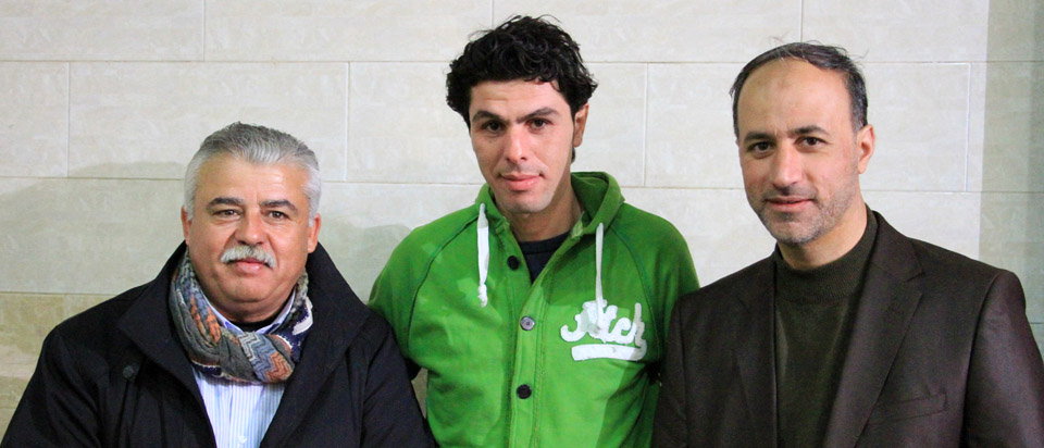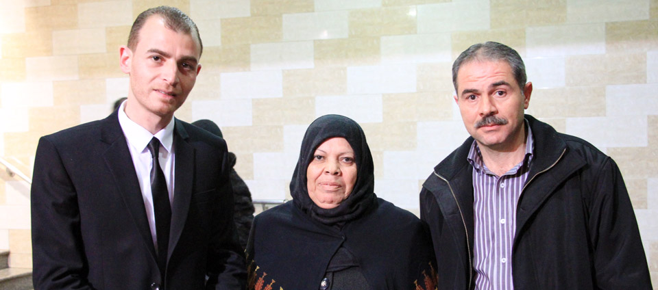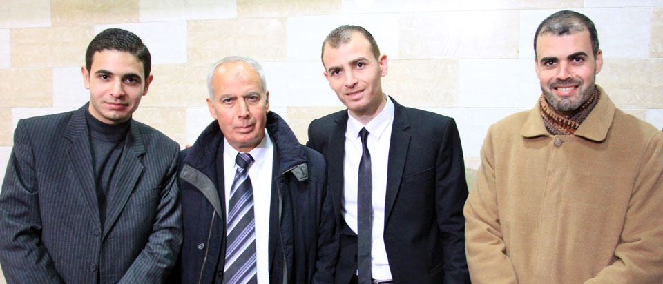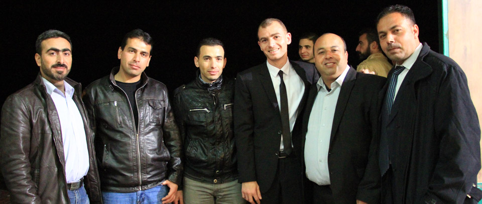 أحمد(شقيق العريس)، د. جواد(عم العريس)، أ. محمد(شقيق العريس)أ. روحي الأغا، الأسير المحرر وائل مطر، العريس، أ. لؤي الكرنز، الاسير المحرر محمد بلوط، أ. حمزة أبو القمصان