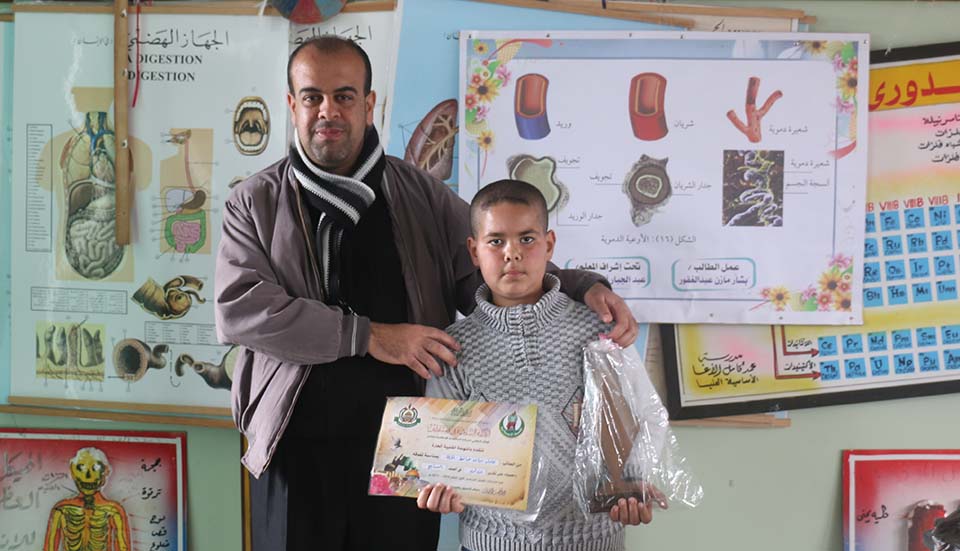 الأول على المختبرات الطالب المتفوق عادل بيان حافظ الأغا مع مدرسه