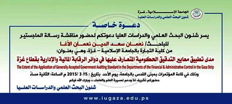 دعوة لحضور مناقشة ماجستير للباحث: نعمان سعدالدين نعمان الأغا يوم الأحد الموافق 15-03-2015 الساعة 2 مساءاً، وذلك في قاعة المؤتمرات بمبنى القدس بالجامعة الإسلامية- غزة .