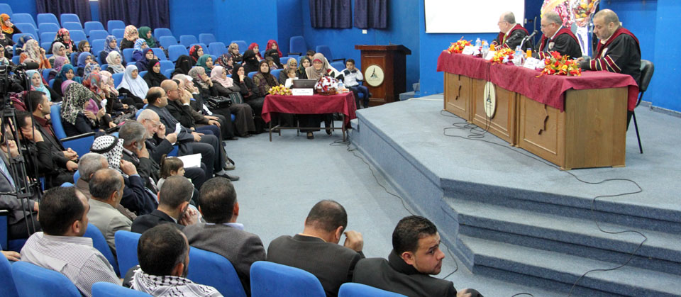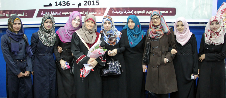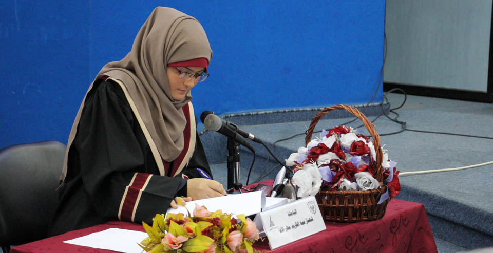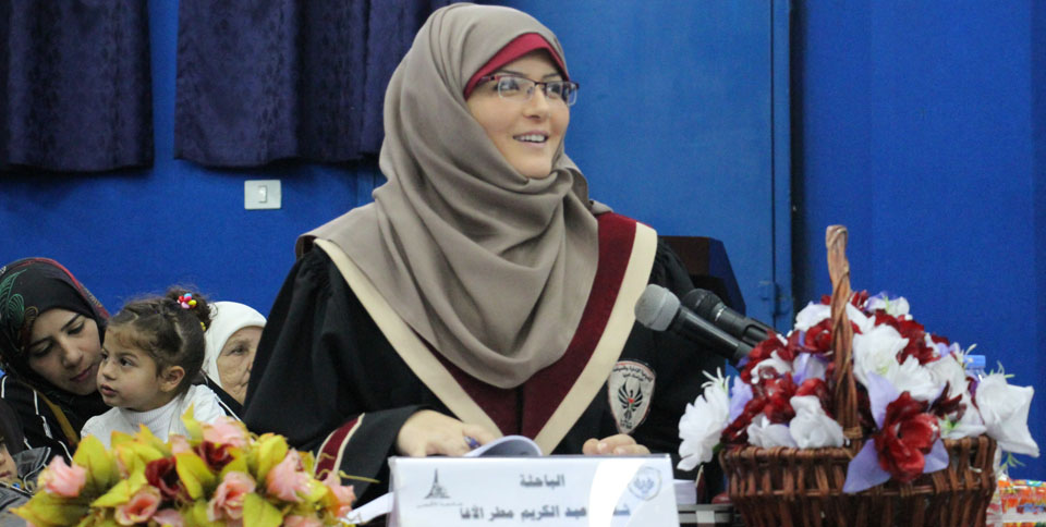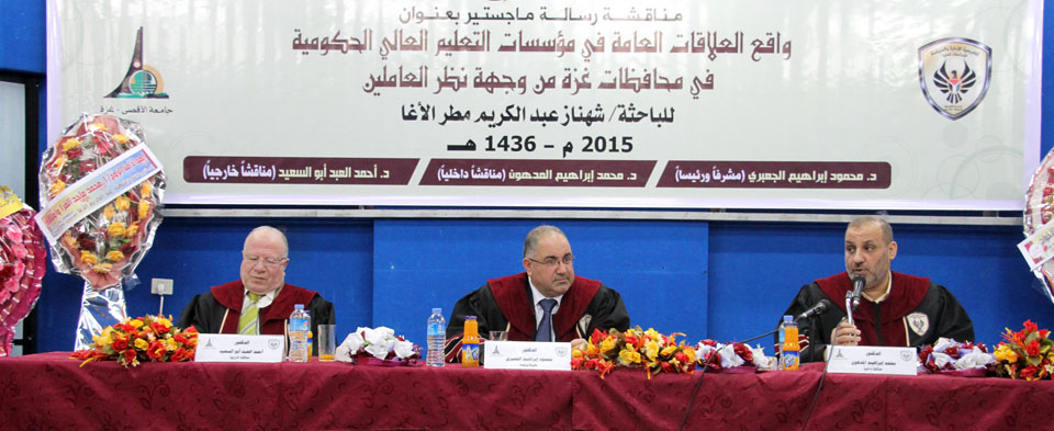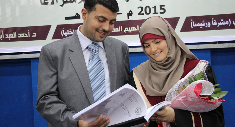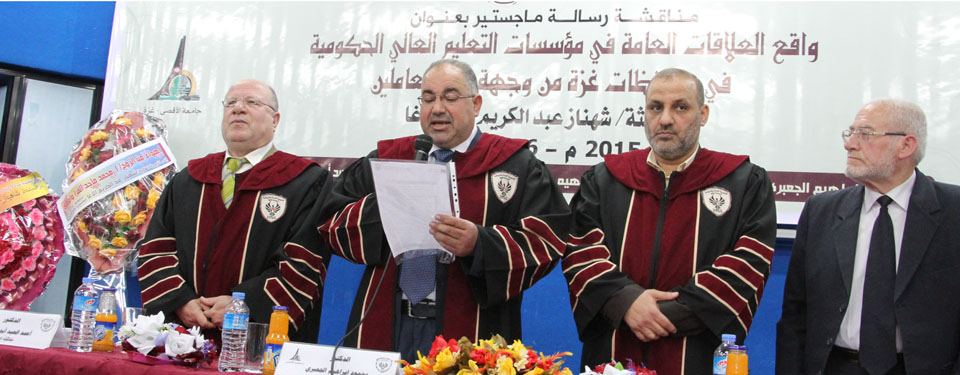 قاعة المؤتمرات- جامعة الأقصى غزة- الأحد الموافق 15-03-2015، الباحثة شاهيناز عبدالكريم تنال درجة الماجستير في العلاقات العامة بعنوان: