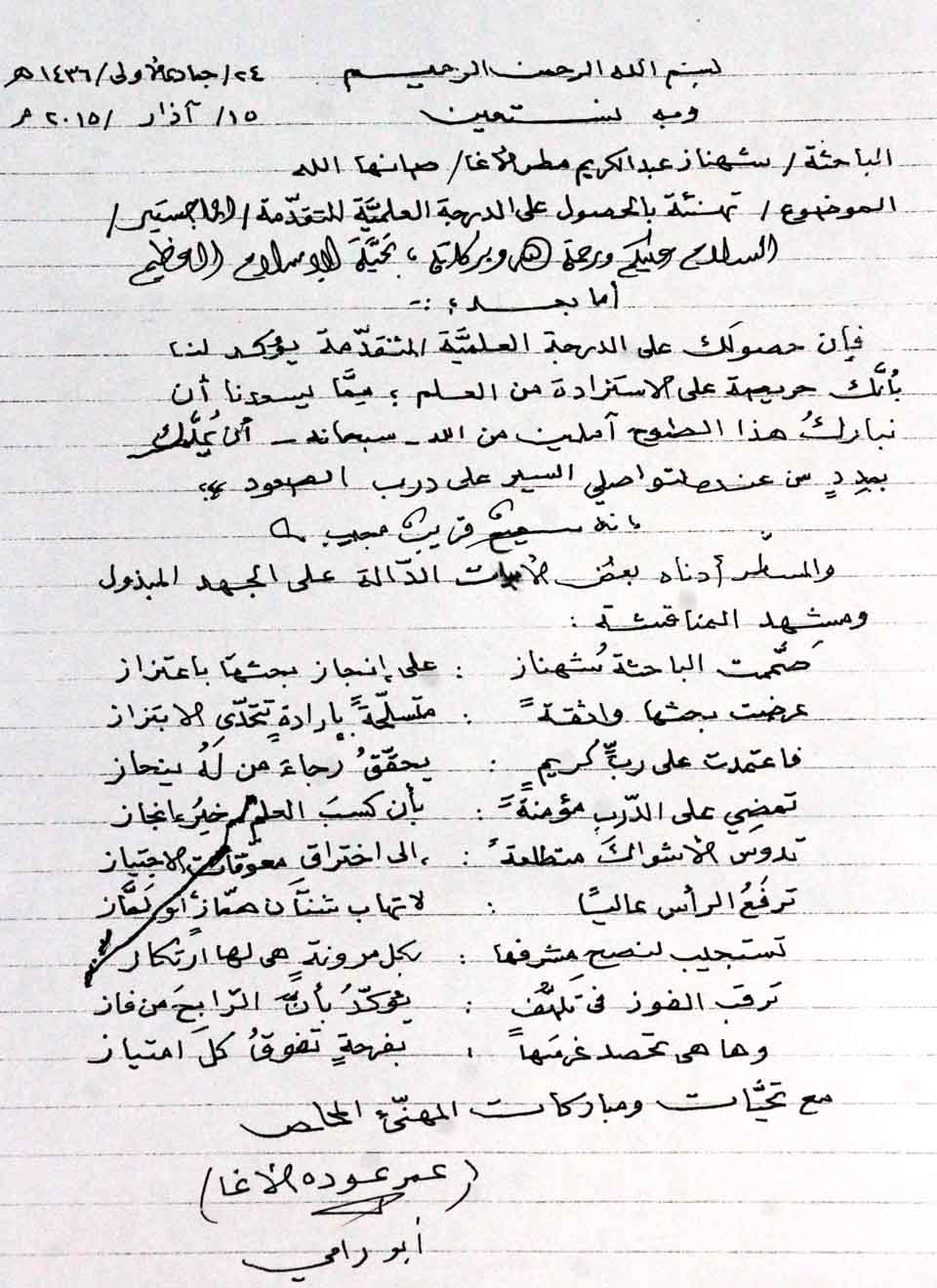 تهنئة أ. عمر عودة الأغا