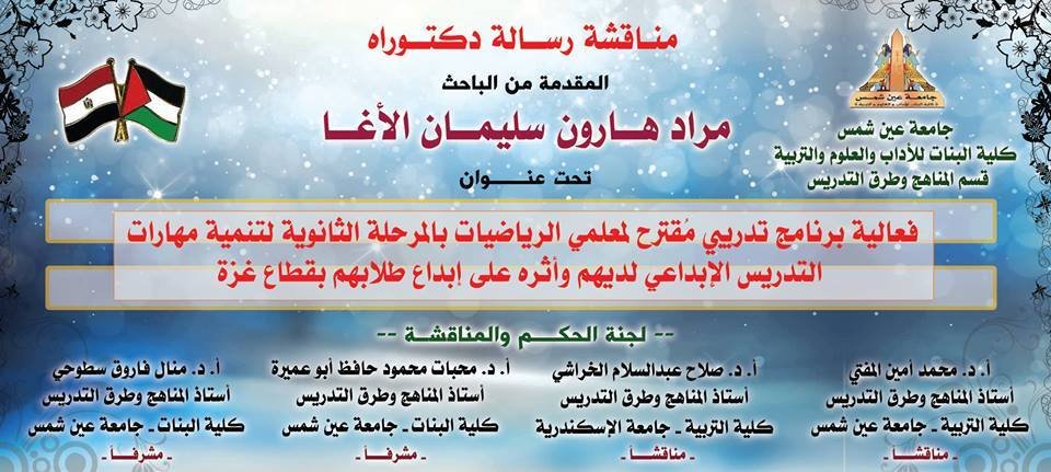 جمهورية مصر العربية- كلية البنات جامعة عين شمس- الثلاثاء- الموافق- 24-03-2015 الباحث مراد هارون سليمان الأغا ينال درجة الدكتوراه تخصص مناهج وطرق تدريس الرياضيات بعنوان: