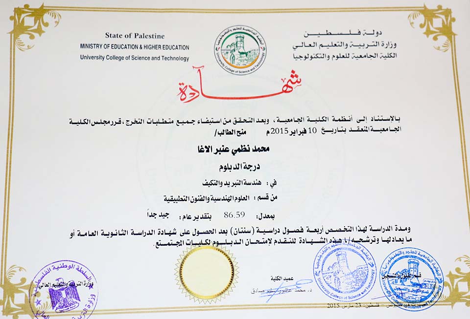 تخرج أ. محمد نظمي عنبر شاكر الأغا، في الكلية الجامعية للعلوم والتكنولوجيا، قسم العلوم الهندسية والفنون التطبيقية تخصص هندسة التبريد والتكييف، وألف مبارك