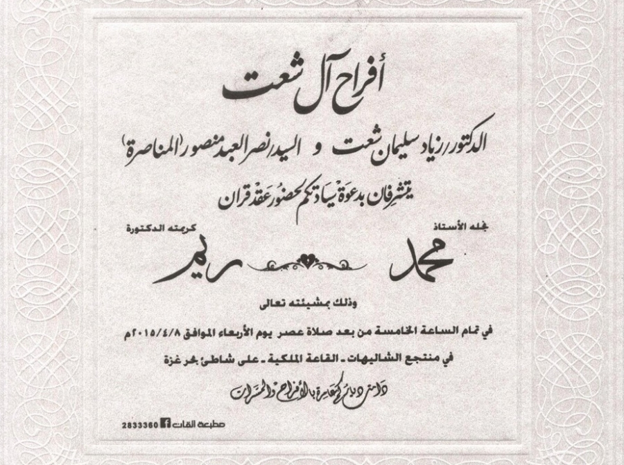 القاعة الملكية- منتجع الشاليهات- شاطيئ بحر غزة- الاربعاء الموافق 08-04-2015 عقد قران أ. محمد زياد سليمان شعت إلى صاحبة الصون والعفاف د. ريم نصر العبد منصور المناصرة، وألف مبارك