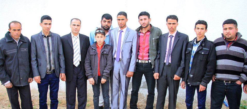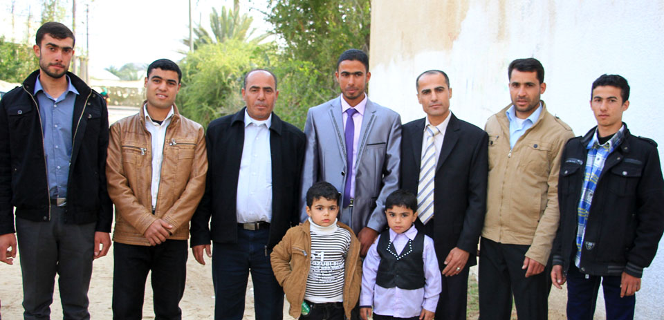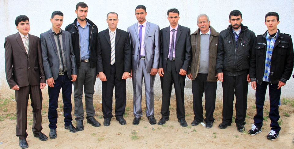 ياسر(عم العروس)، محمد حسن(خال العروسين)، إبراهيم محمد الأغا، والد العروس، العريس، عماد مروان الأغا،