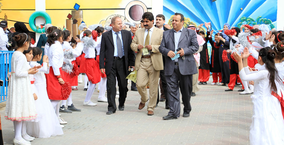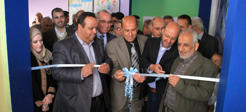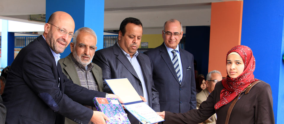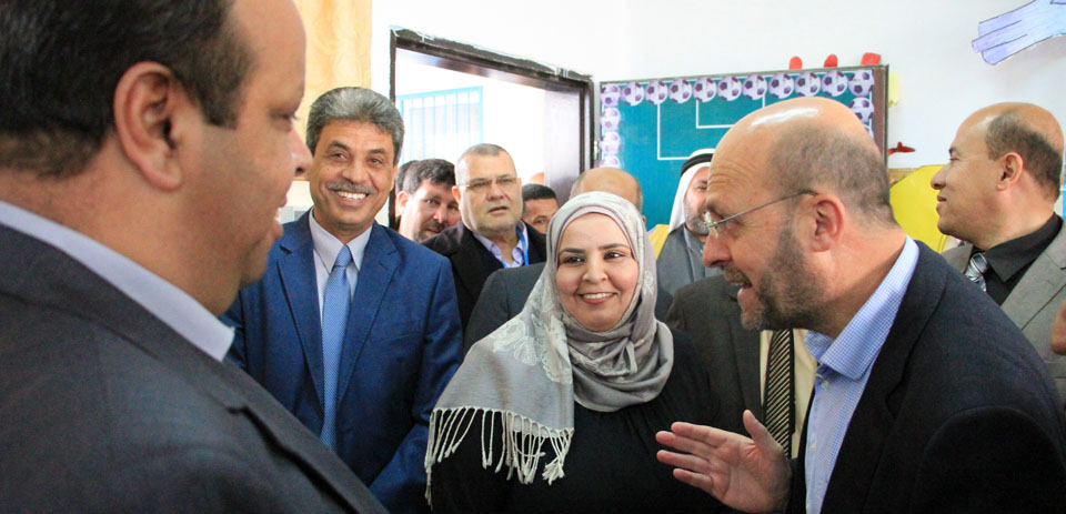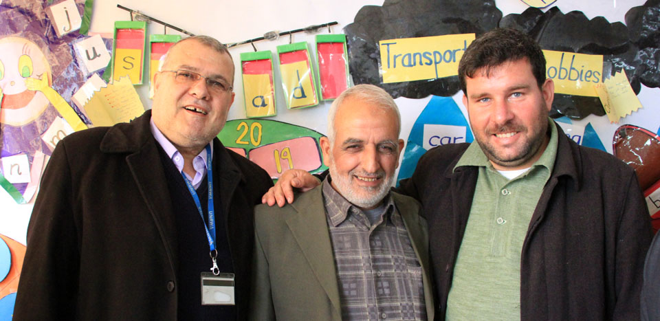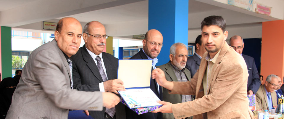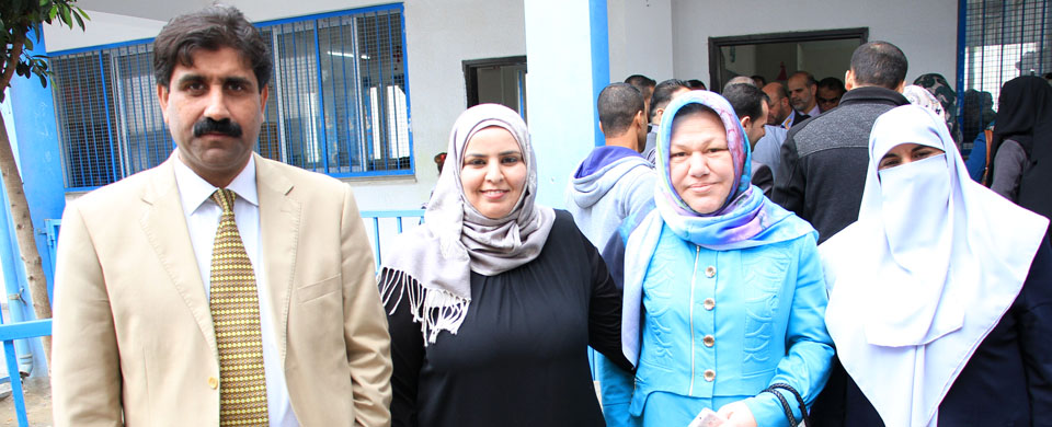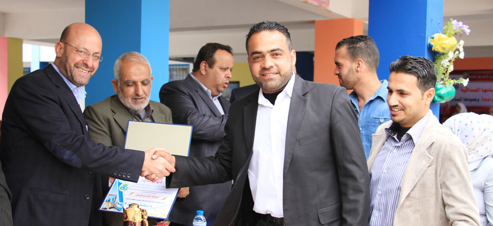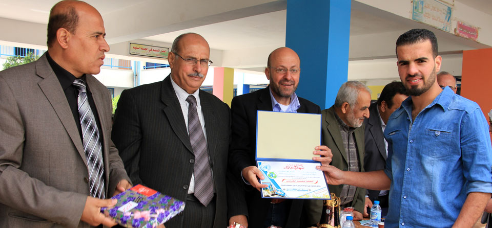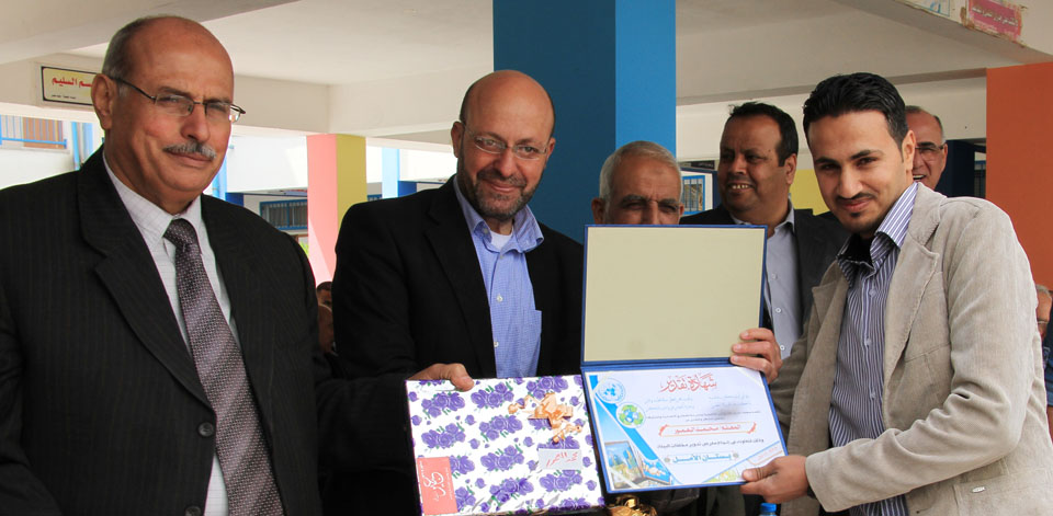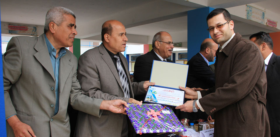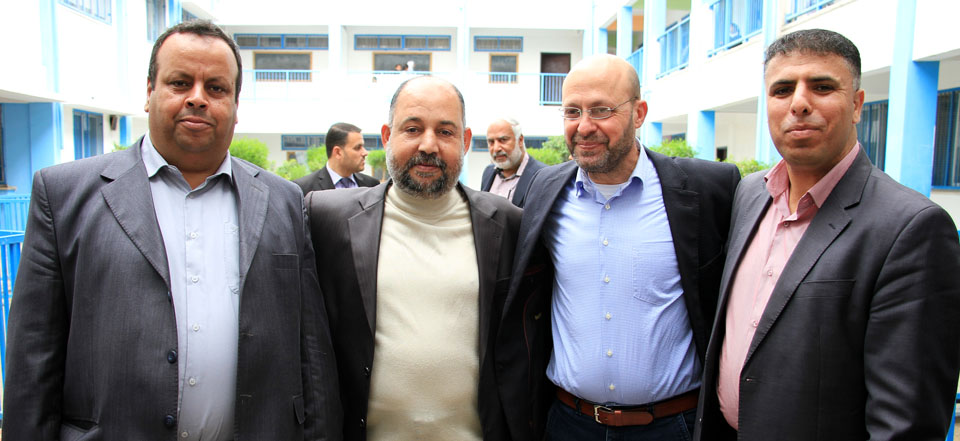 أ. علاء حرب، أ. جمال الحمامي مدير مدرسة الفخاري ذكور، أ. إبراهيم عواد مدير منطقة، أ. زياد عاشور مدير البنك الإسلامي الفلسطيني -خان يونس،
