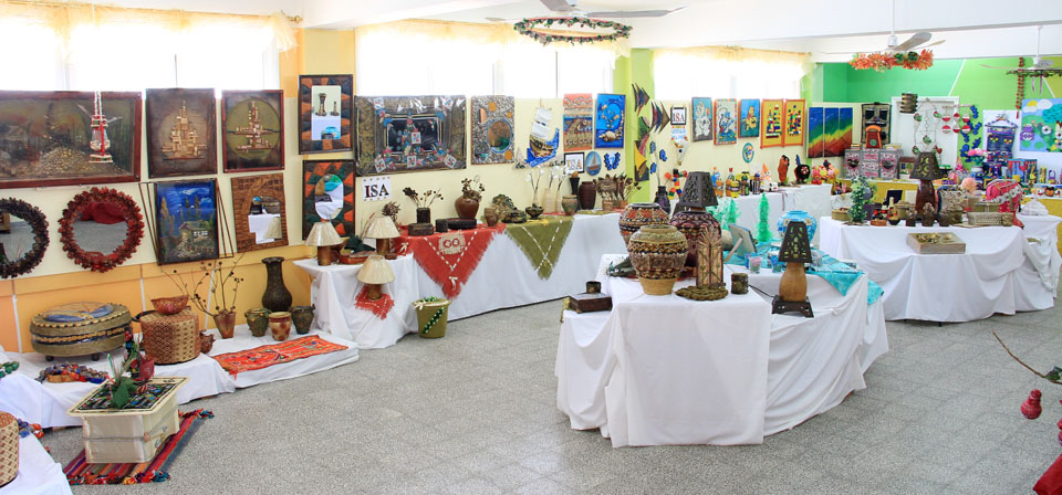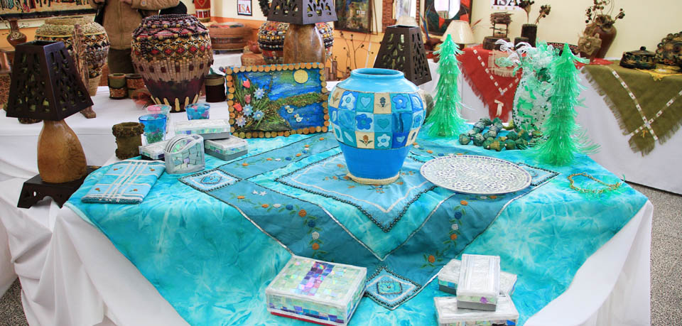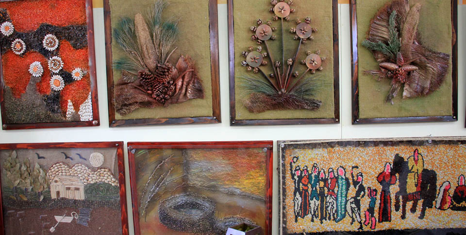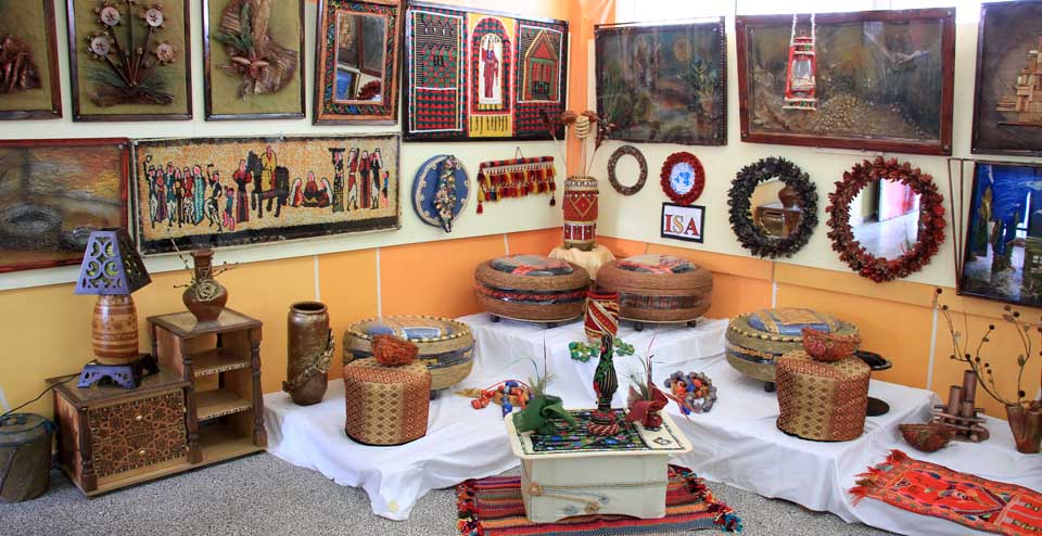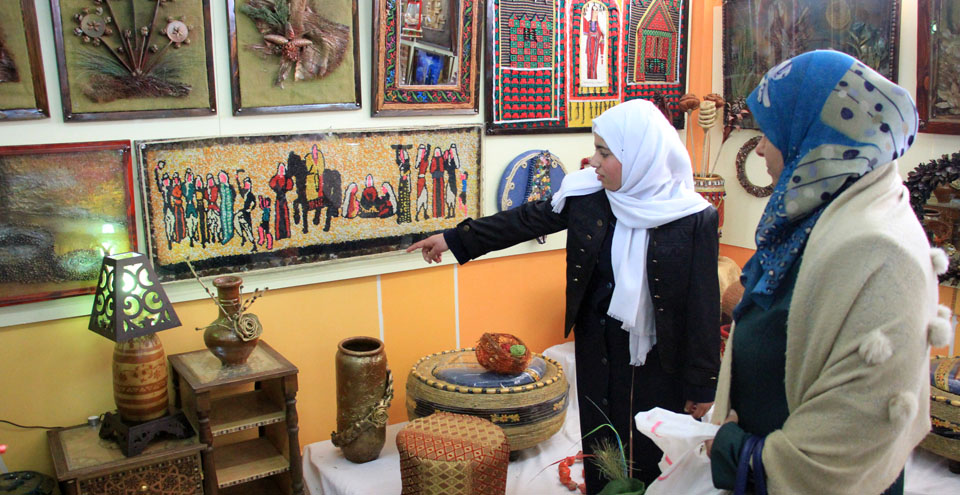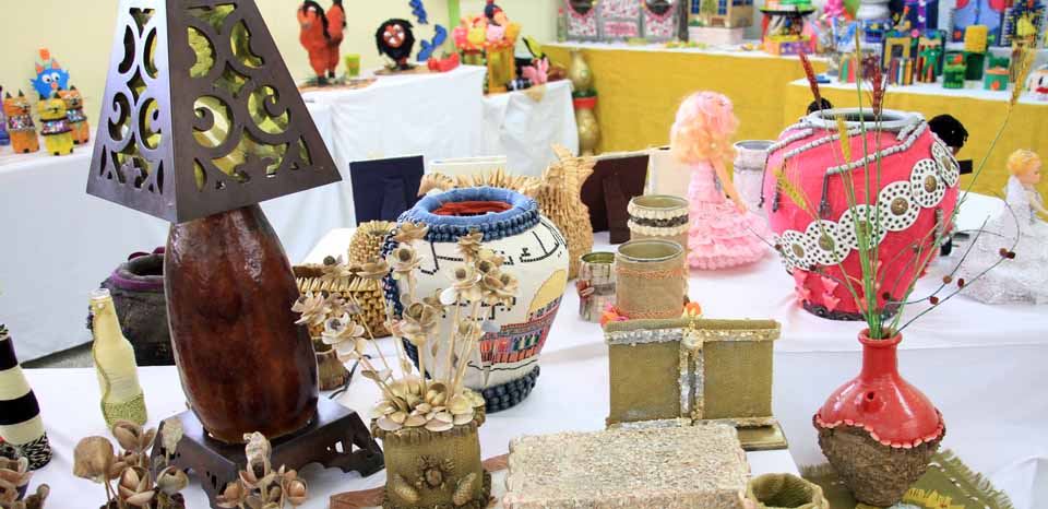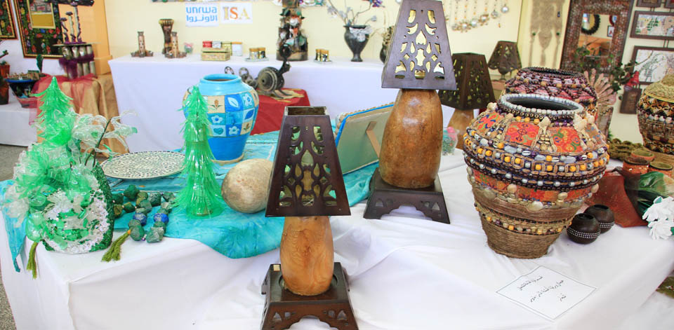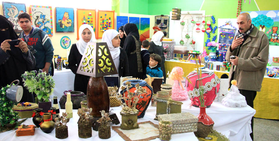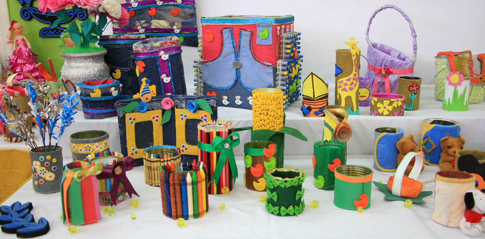 ويحتوي المعرض علي إطارات للسيارات تم إعادة تدويرها وكسوها بأثواب فلاحي قديمة، وأبجورات مصنوعة من قرع الطعام، ومرايا مصنوعة من العلب المعدنية، وبراويز بكل أنواع الثمار المختلفة وألعاب متميزة تم صناعتها بأشكال فنية راقية