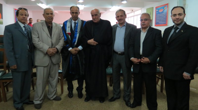 الباحث يتوسط لجنة مناقشة الحكم بعد قرار منح درجة الدكتوراة