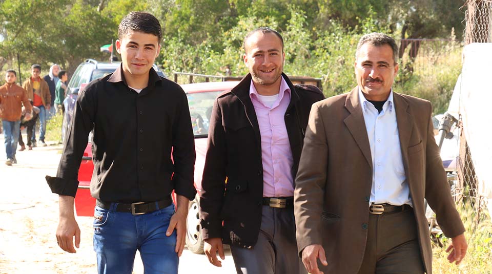 الحاج عبدالرحيم عودة الأغا( والد العروس) وشقيه الحاج فالوجي، الشيخ ناجي الأغا، الحاج يحيى الأسطل (والد العريس)، العريس