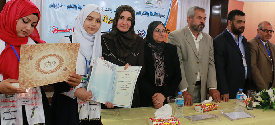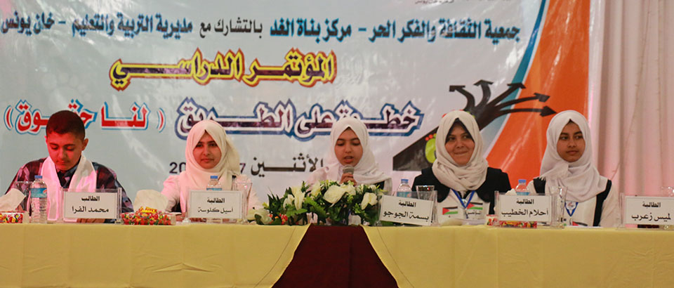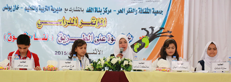 خان يونس- صالة كريستال بلاس- السطر الغربي- الإثنين الموافق 27-4-2015- لنا حقوق الإسم الذي أطلقوه فتيان وفتيات مركز بناة الغد التابع لجمعية الثقافة والفكر الحر ،على مؤتمرهم الحقوقي ،الذى نظموه بالتشارك مع مديرية التربية والتعليم في خانيونس ،في قاعة كريستال بلاس ،غرب محافظة خان يونس ،بحضور قيادات وزارة التربية والتعليم ،واكاديميين ،وكوادر تعليمية وتربوية من التعليم والجامعات الفلسطينية ،وممثلي عن المؤسسات الاهلية والحكومية والحقوقية ووجهاء ومخاتير المحافظة و جمهور غفير .