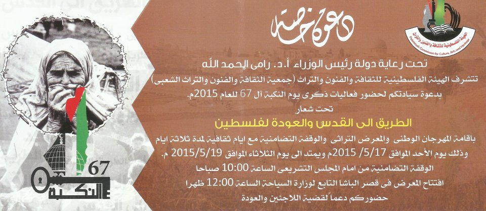 غزة- قصر الباشا- الأحد الموافق 17-5-2015- بدعوة من جمعية مخاتير فلسطين ومكتب رئيس الوزراء د. رامي الحمد لله، موقع النخلة يشارك في المهرجان الوطني والمعرض التراثي والوقفة التضامنية، والتي تشرف عليها الهيئة الفلسطينية للثقافة والفنون والتراث.