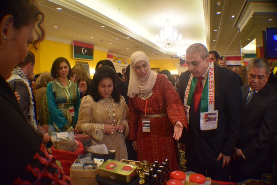 و في الجناح الفلسطيني بالبازار و المعرض، كانت حرم السفير الفلسطيني لدى ماليزيا د انو ر الاغا و الى جانبهما الموظفات بالسفارة، في استقبال سيدة ماليزيا الاولى روسما منصور، حيث رحبت بها حرم السفير و قدمت لها شرحا عن جوانب التراث الفلسطيني و المنتجات و المأكولات الفلسطينية، و عبرت السيدة الاولى عن إعجابها بجوانب التراث الفلسطيني، خاصة الثوب الفلسطيني المطرز و الشالات والكوفية الفلسطينية، التي اعتبرتها رمزا للشعب الفلسطيني، علاوة على إعجابها بالمنتوجات و المأكولات الفلسطينية، كزيت الزيتون و الزعتر و الجبنة و الزيتون