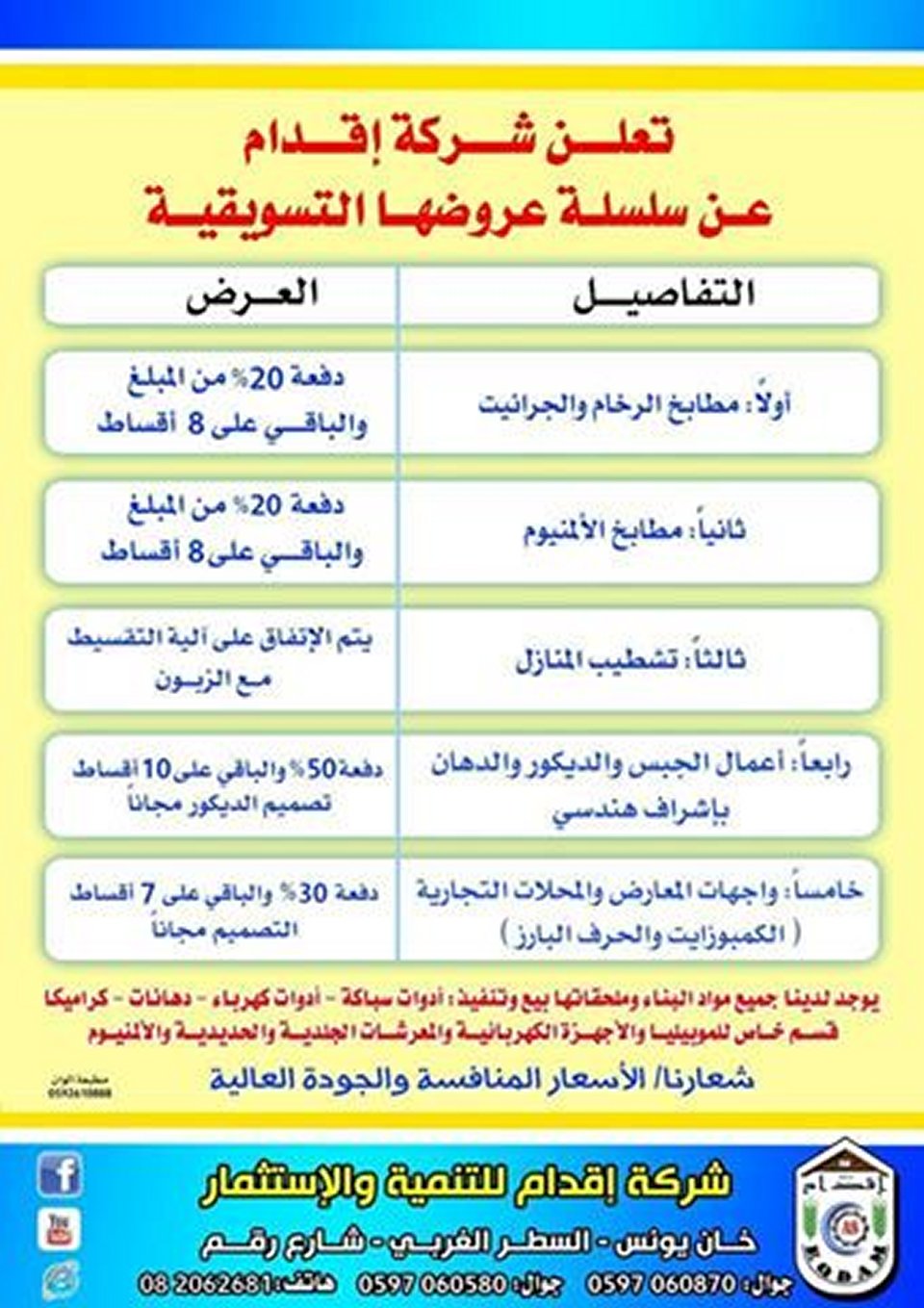 قامت شركة إقدام للتنمية والاستثمار بخان يونس باكبر حملة تسويقية في قطاع غزة وذلك صباح اليوم الأربعاء 13-5-2015م, حيث قدمت الشركة اكبر عروض تسويقية وبأسعار منافسة بين يدي ابناء شعبنا بهدف التسهيل عليهم وذلك نظرا للظروف القاسية التي يمر بها أبناء شعبنا , حيث جابت فرق التسويق شوارع مدينة خاتيونس ولاقت الحملة ترحيبا واسعا من المواطنين .