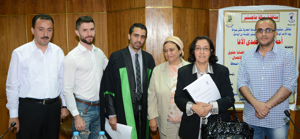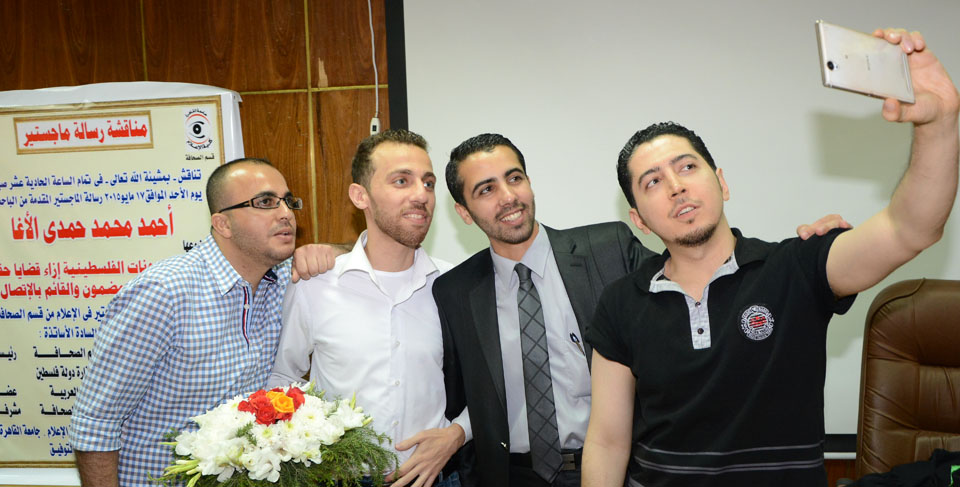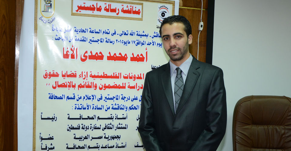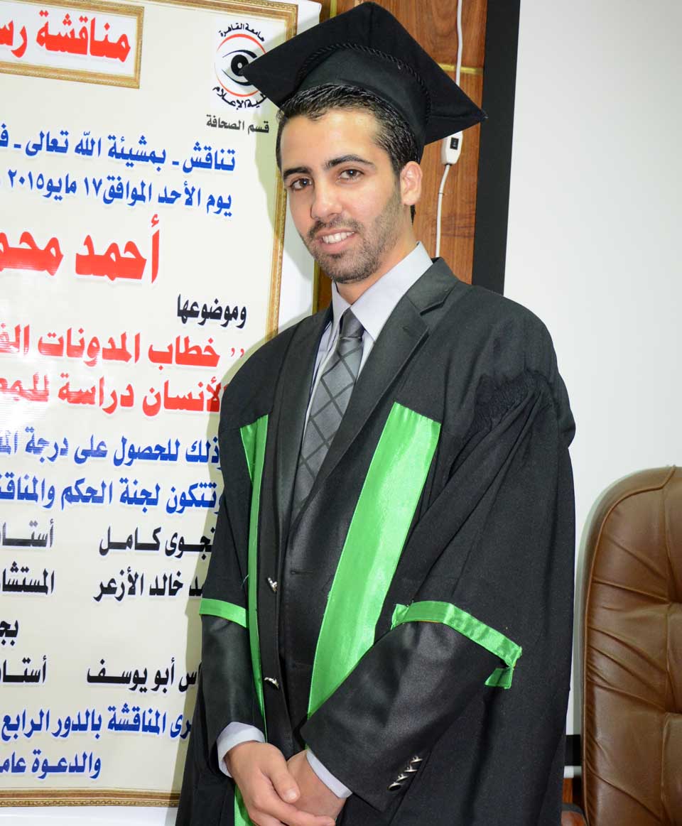 جمهورية مصر العربية- القاهرة- الأحد الموافق 17-05-2015، الباحث أحمد محمد(يزيد) حمدي الأغا ينال درجة الماجستير في الإعلام الجديد بتقدير ممتاز من قسم الصحافة بكلية الإعلام - جامعة القاهرة، بعنوان: