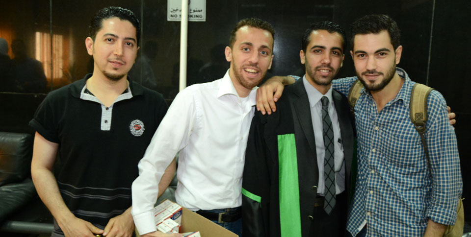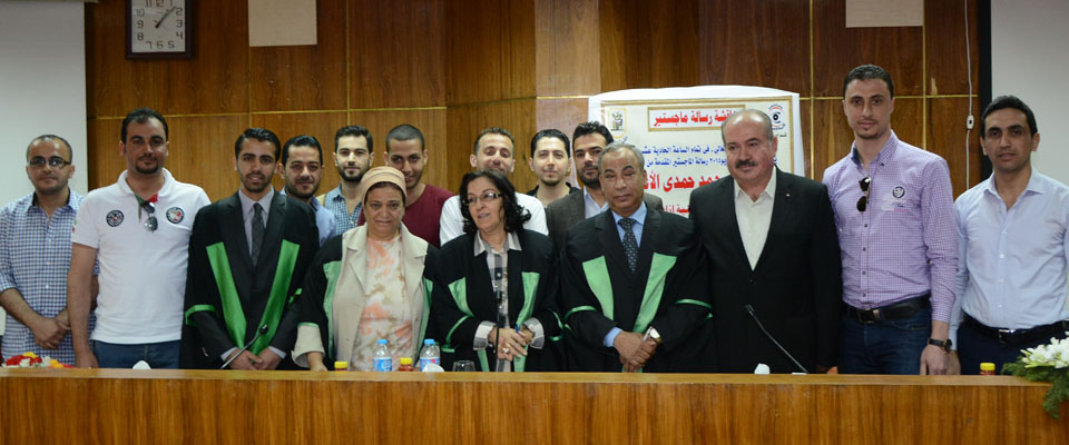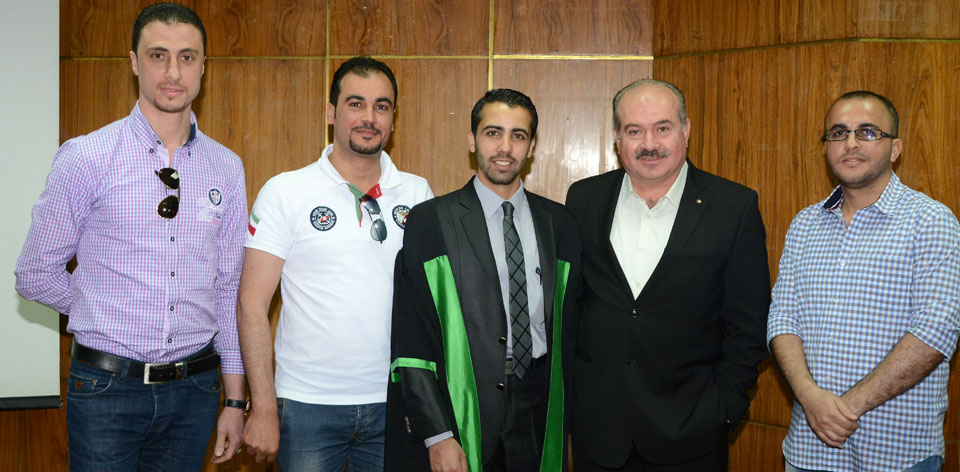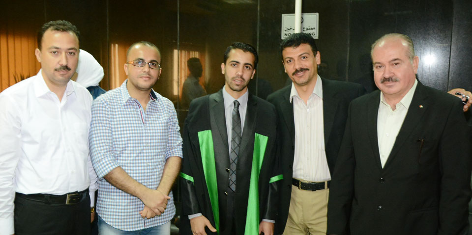 أ. بسام زهير الأغا، مهندس طيار سعيد عصام، الباحث، د. نبيل سليم حمدان، د. سهيل محمد طاهرالباحث وأعضاء لجنة المناقشة