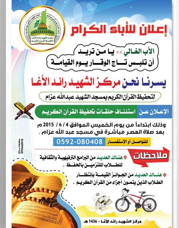 أعلنت إدارة مركز الشهيد رائد الأغا لتحفيظ القرآن الكريم بمسجد الشهيد الدكتور عبد الله عزام ، عن انطلاق مخيم زاد المتقين الأول بمشاركة عشرات الطلبة من أبناء المنطقة وأوضحت إدارة المخيم أنه يقوم على الأمور التربوية إلى الجانب الأساسي وهو حفظ القرآن الكريم ، لتحقيق أحد الأهداف السامية للمركز وهو تخريج الشبل الحافظ الخلوق المهتم بتعاليم دينه .
