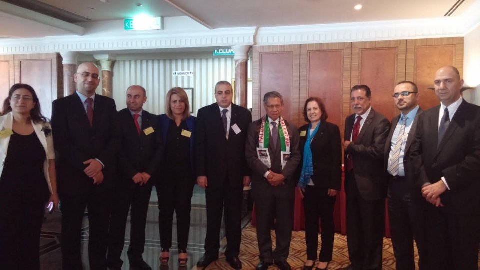 د. أنور الأغا و داتو سري محمد مصطفى (وزير التجارة الدولية والصناعة الماليزي) يتوسطا الوفد الفلسطيني
