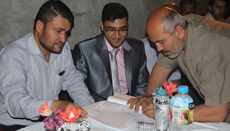 خان يونس- السطر الغربي- منزل والد العروس- الأربعاء الموافق 10-6-2015- عقد قران صاحبة الصون والعفاف أ. حنان نزيه محمد الأغا إلى أ. خليل صالح عودة محمود سلامة، وألف مبارك.