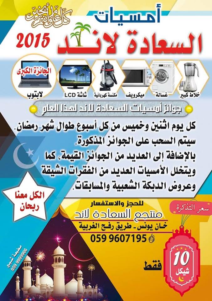 الرئيسة/إعلانات /منتجع السعادة لاند 2015 إعلانات منتجع السعادة لاند 2015 تاريخ النشر : الإثنين | 22-06-2015 | 17:10 12196 أمسيات السعادة لاند 2015 اضغط هنا للتواصل أو التعرف على السيد يحيى زكريا على محمد علي حمدان النجار يمكنك تلقي أحدث الأخبار أول بأول بانضمامك لإحدى مجموعات الواتساب الخاصة بالعائلة من خلال الضغط هنـا اظهر المزيد