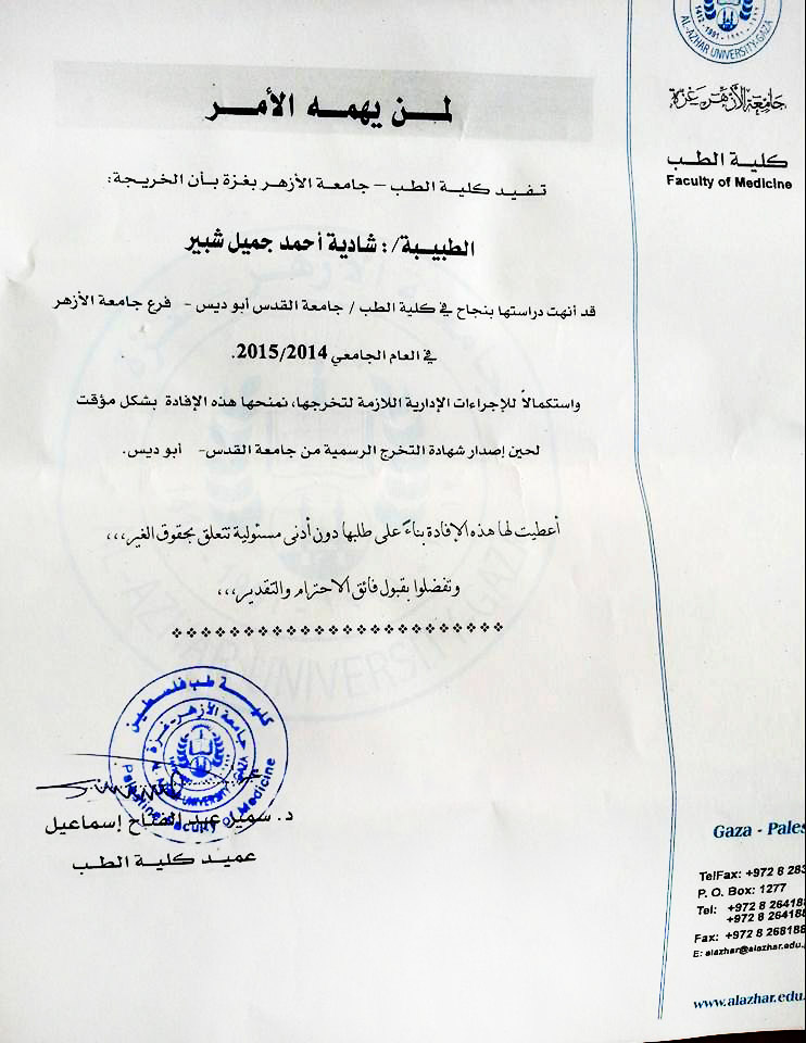 الرئيسة/تخرج بكالوريوس/تخرج الطالبة شادية أحمد جميل شبير في كلية الطب- جامعة القدس أبوديس تخرج بكالوريوس تخرج الطالبة شادية أحمد جميل شبير في كلية الطب- جامعة القدس أبوديس تاريخ النشر : الإثنين | 29-06-2015 | 10:03 13350 تخرج الطالبة شادية أحمد جميل شبير في كلية الطب- جامعة القدس أبوديس- فرع جامعة الأزهر غزة، وألف مبارك يمكنك تلقي أحدث الأخبار أول بأول بانضمامك لإحدى مجموعات الواتساب الخاصة بالعائلة من خلال الضغط هنـا اظهر المزيد