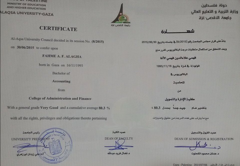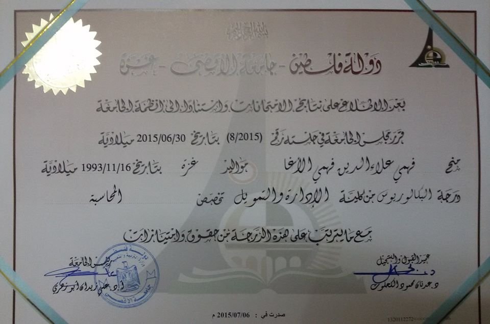 تخرج الطالب فهمي علاء فهمي الأغا، وحصوله على درجة البكالوريوس في جامعة الأقصى، بقسم المحاسبة في كلية الادارة والتمويل، بتقدير عام جيد جداً، والف مبارك.