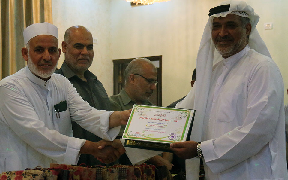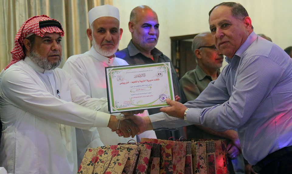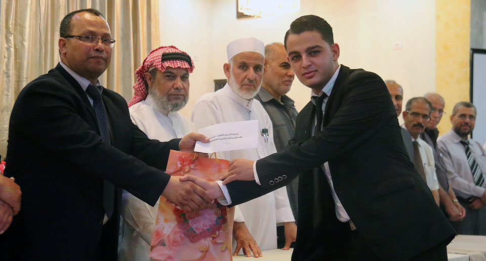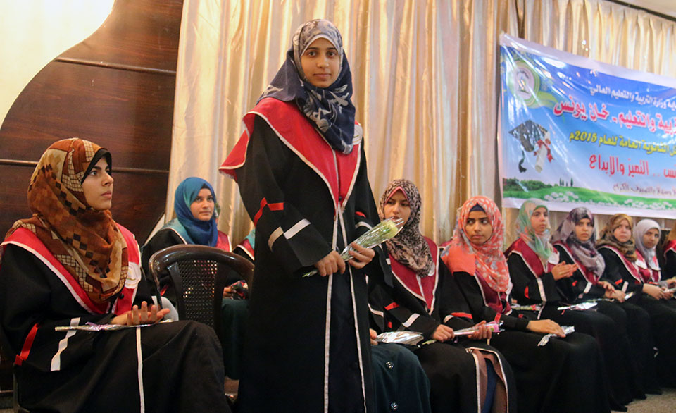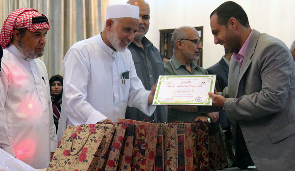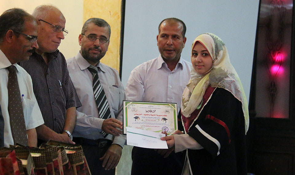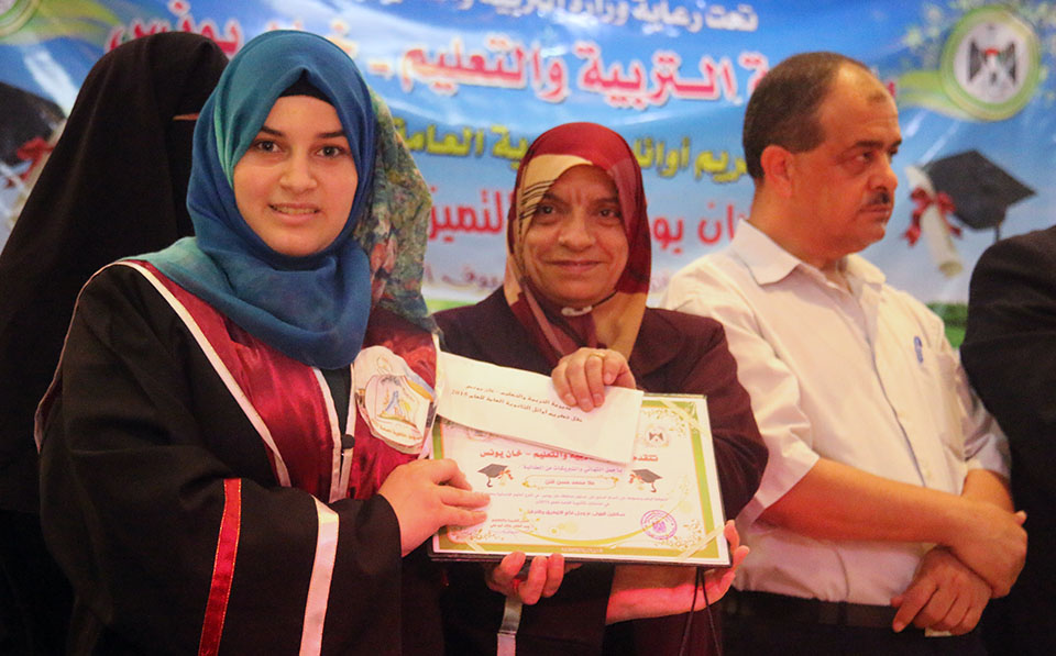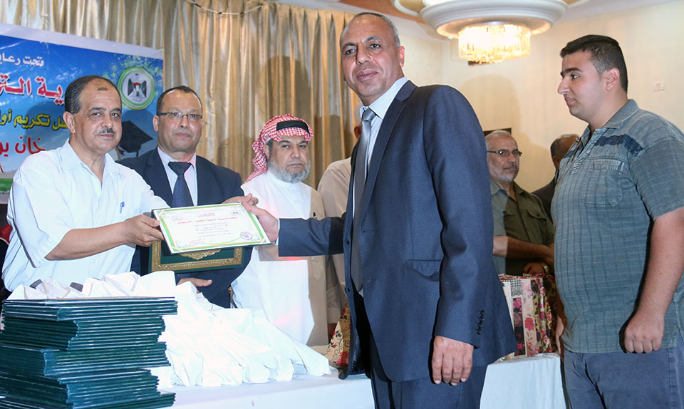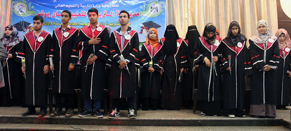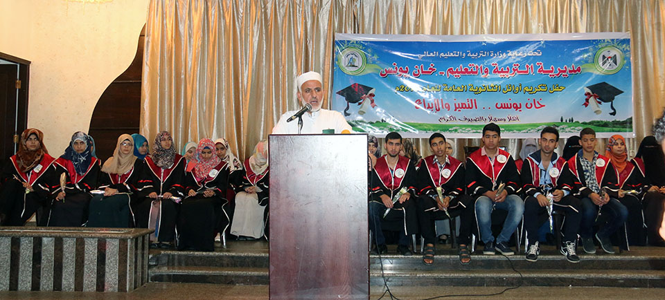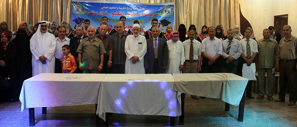 كرمت مديرية التربية والتعليم بخان يونس صباح اليوم الإثنين الموافق 13/7/2015، في حفل مهيب بعنوان (خان يونس.. التميز والإبداع) أوائل الثانوية العامة للعام 2015، والداعمين للمسيرة التربوية في صالة رويال بالاس بحضور: د. يونس الأسطل، وأ. يحيى العبادسة النائبين في التشريعي، وسماحة مفتي خان يونس الشيخ إحسان عاشور، وم. يحيى الأسطل رئيس بلدية خان يونس، ود. محمد أبو شقير وكيل وزارة التربية والتعليم العالي الأسبق، وأ. عبد القادر أبو علي مدير التربية والتعليم بخان يونس، وأ. علي أبو حسب الله مدير التربية والتعليم بالوسطى، وأ. حسين أبو شمالة مدير الدائرة الإدارية بخان يونس، وأ. ناصر السدودي مدير الدائرة الفنية بخان يونس، وأ. نصر سهمود مدير الدائرة الفنية بمديرية الوسطى، وأ. سعيد قديح مدير الدائرة الإدارية بمديرية شرق خان يونس، وأ. فاطمة الجعيثني مدير التربية والتعليم الأسبق بخان يونس، وأ. عبد المجيد الزطمة مدير التربية والتعليم الأسبق بخان يونس، ونخبة من رؤساء الأقسام في المديريات الجنوبية، ونخبة من المشرفين التربويين، وعدد من مديري ومديرات المدارس وبعض المعلمين والمعلمات، وممثلي المؤسسات المجتمعية الداعمة للمسيرة التعليمية، ولفيف من أولياء الأمور.
