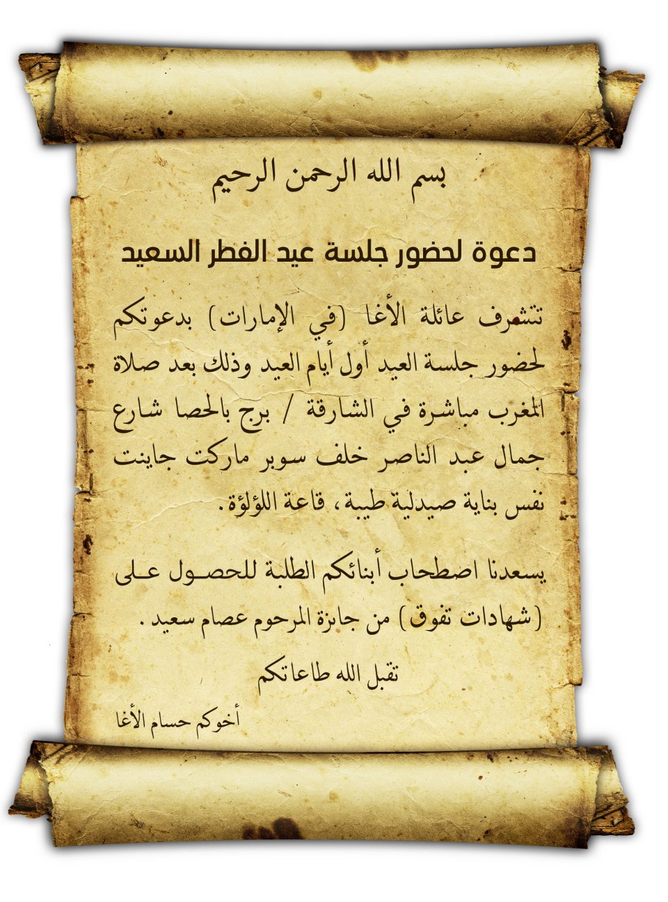 الرئيسة/أعياد/الإمارات- دعوة لحضور جلسة عيد الفطر 2015 أعياد الإمارات- دعوة لحضور جلسة عيد الفطر 2015 تاريخ النشر : الإثنين | 13-07-2015 | 23:04 10379 اضغط هنا للتواصل أو التعرف على أ. حسام عثمان محمد حمدان الأغا يمكنك تلقي أحدث الأخبار أول بأول بانضمامك لإحدى مجموعات الواتساب الخاصة بالعائلة من خلال الضغط هنـا اظهر المزيد
