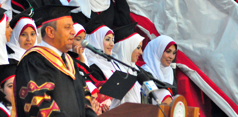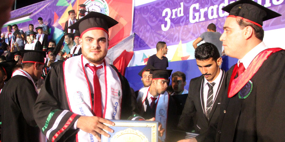 ومن جانب آخر عبر الطالب إسلام سكر من كلية القانون والممارسة القضائية خلال كلمته التي ألقاها باسم زملائه الخريجين، عن الأهمية الكبيرة التي تحملها هذه المناسبة في قلوب زملائه وعائلاتهم، والتي انتظروها لسنوات طوال، وبعد مشوار طويل من الكد والعمل الدؤوب، في ظل الظروف الحالية الصعبة التي لم تمنعهم من التفوق الدراسي، متقدماً بشكره وامتنانه لأساتذته ولكافة طواقم الجامعة الأكاديمية والإدارية لما قدموه من دعم لهم خلال سنوات دراستهم، وأبرق بتحياته لأولياء الأمور الذين بذلوا كافة الجهود ومهدوا كافة الصعاب للأخذ بأيدي أبنائهم نحو التفوق والنجاح.