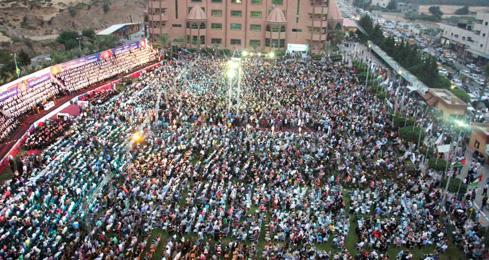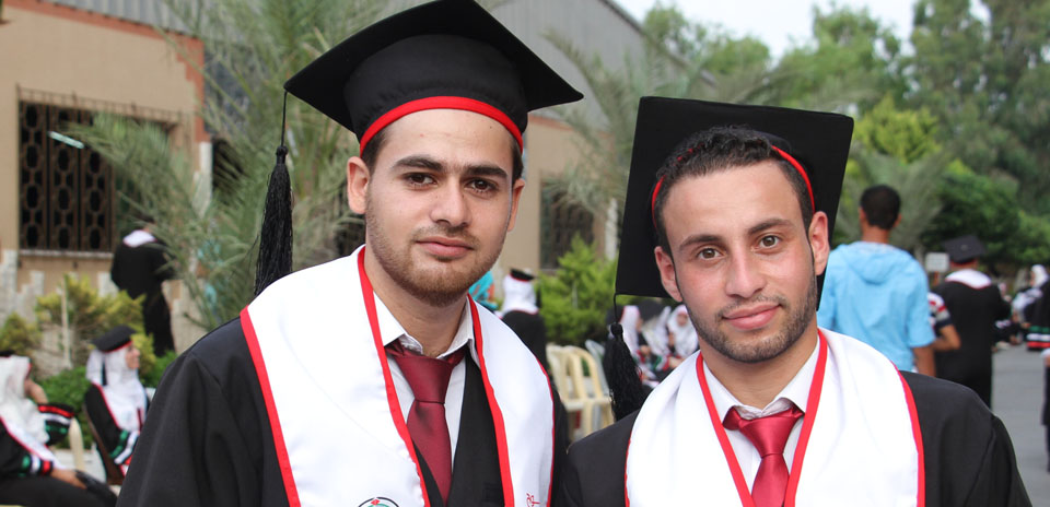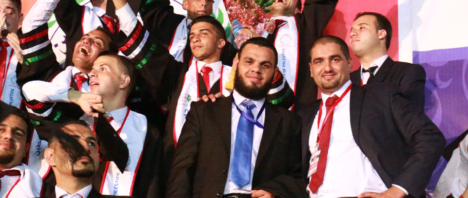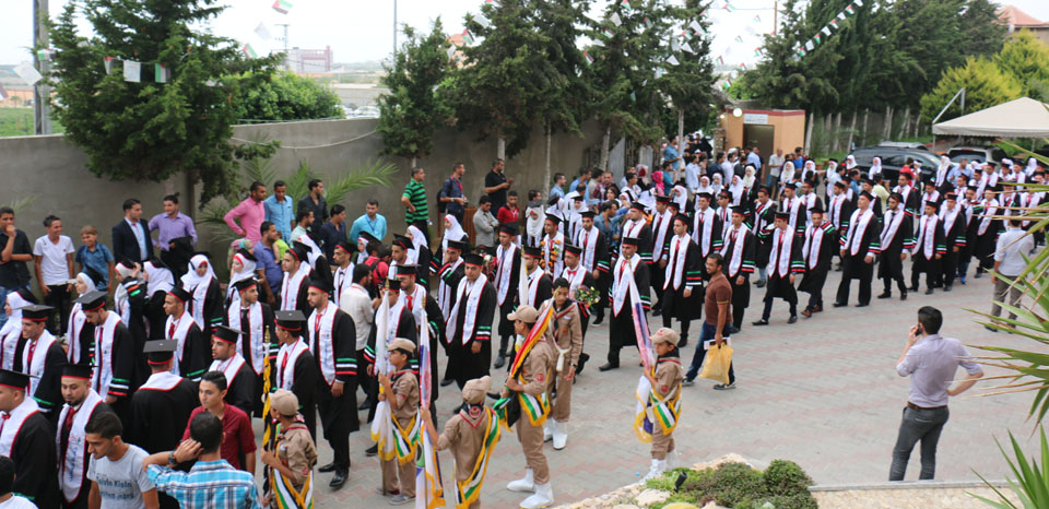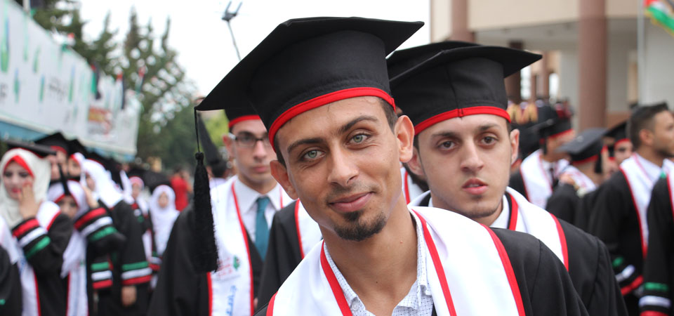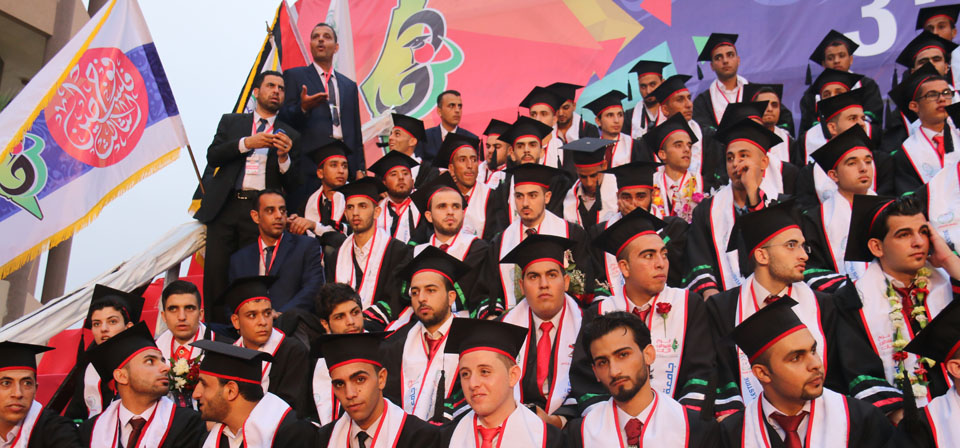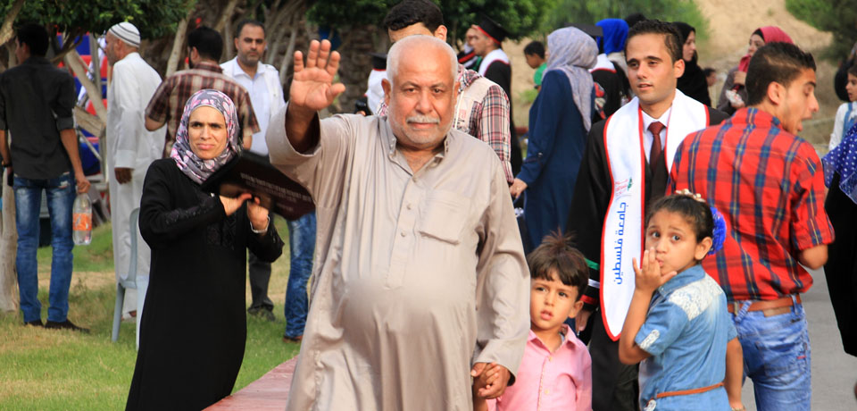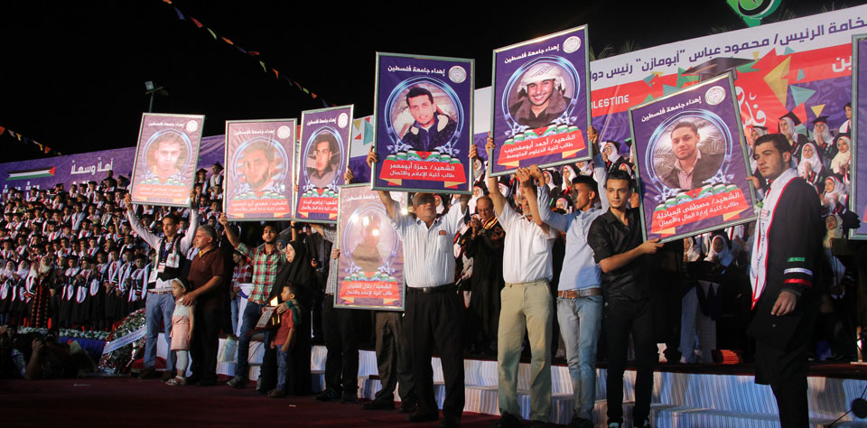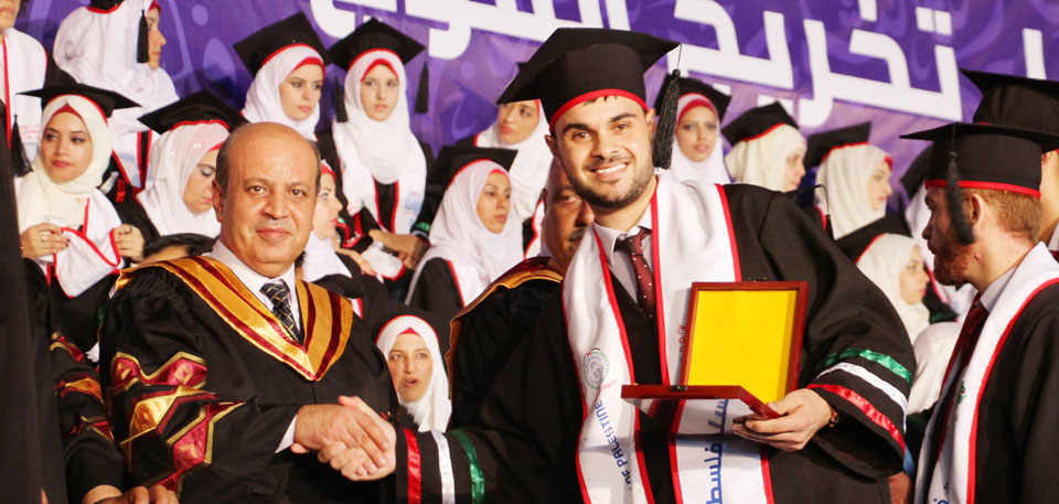 كما أبرق رئيس الجامعة بالتحية إلى أهلنا في القدس والضفة الغربية، والأسرى في سجون الاحتلال، والشهداء الذين قضوا خلال مسيرة النضال الفلسطيني وشهداء الجامعة، معلناً منح جامعة فلسطين للطفل الشهيد علي سعد دوابشة درع الجامعة ووسام التميز، وأن الجامعة ستطلق اسم الطفل الشهيد دوابشة على قاعة المؤتمرات الكبرى فيها، كما أثنى على أهلنا في مخيمات اللجوء، مؤكداً تجديد الجامعة لمنحتها السنوية لأهلنا اللاجئين الوافدين إلى قطاع غزة خاصة من ليبيا واليمن، مختتماً كلمته بتهنئة الخريجين متمنياً لهم النجاح والتوفيق، وأن يكون "فوج فلسطين" فاتحة خير لاستكمال المصالحة وانهاء الانقسام والانطلاق نحو بناء مؤسسات الدولة الفلسطينية في أجواء تسودها المحبة والوئام.