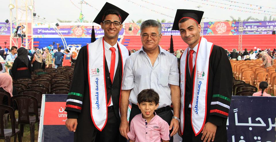 كما هنأ رئيس مجلس الإدارة الطلبة الخريجين موضحاً أن المرحلة المقبلة ستكون مرحلة العمل والعطاء، وأثنى على كافة من ساهم وشارك في مسيرة الجامعة، وعلى كافة الحضور ومن لبى دعوة الجامعة للحفل، مؤكداً أن جامعة فلسطين جسدت وما زالت تجسد كل معاني الأخوة والوحدة والتلاحم بين أبناء شعبنا العظيم من أجل غد مشرق لأبنائنا وأجيالنا القادمة.