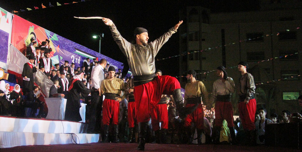 هذا وتخلل حفل التخرج العديد من الفقرات التي شملت تلاوة بروتوكول التخرج من الدكتور محمود العجرمي نائب رئيس الجامعة للشؤون الأكاديمية، تلاها قسم الخريجين مع الدكتور محمد أبو سعدة نائب رئيس الجامعة للشؤون المالية والإدارية، وكذلك تقديم درع الجامعة لمعالي الدكتور كمال الشرافي ممثلاً عن الرئيس، وتكريم أهالي طلبة جامعة فلسطين الشهداء، وتكريم مدراء التعليم في محافظات قطاع غزة، وتتويج الطفل الشهيد علي دوابشة بوسام الجامعة، وتسليم دروع وشهادات التفوق للخريجين الأوائل، وشهادات التكريم لكافة الخريجين، كما وتخلل الحفل فقرات وعروض فنية من التراث الوطني والدبكة الشعبية لفرقة أهل الشام، وفريق العنقاء للفنون الشعبية.