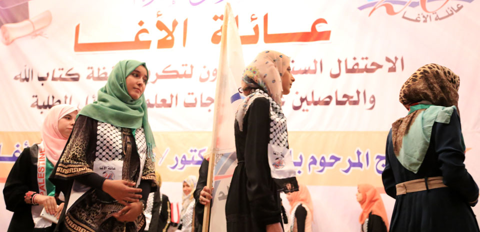 وخلال الحفل تم تكريم حوالي (400) خريج من أبناء العائلة حيث شملت المرحلة الأولى منه تكريم حفظة القرآن الكريم والحاصلين على السند ومن ثم الحاصلين على درجة الدكتوراه والماجستير، فيما شملت المرحلة الثانية تكريم الطلبة الحاصلين على شهادتي البكالوريوس والدبلوم المتوسط والشهداء الخريجين، حيث تم تكريم أسرة الشهيدين "محمد شكيب الأغا" و"محمد فضل الأغا" بمنحهم شهادة عز وفخار، مبرقين في الوقت ذاته التحية لعميد أسرى قطاع غزة المناضل الأسير "ضياء الأغا" القابع في سجون الإحتلال الإسرائيلي وأيضاً لأسرة الأسير "محمد أزويد الأغا.