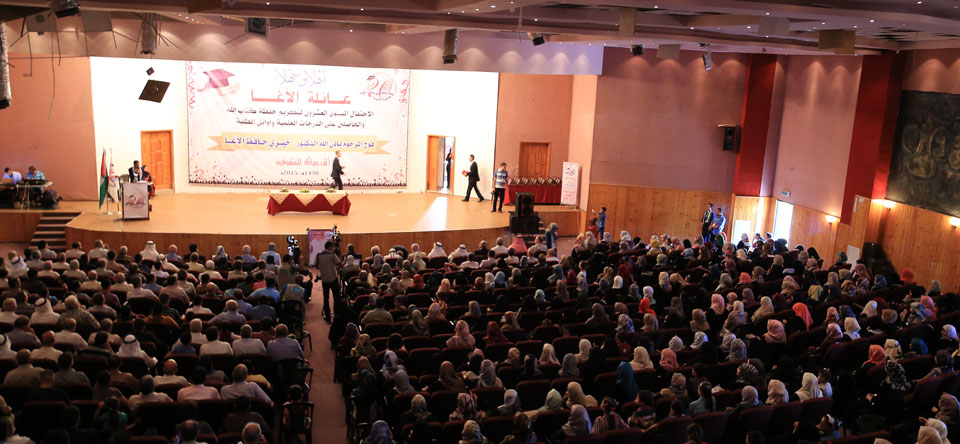 حيث تزينت جدران المركز الثقافي بصورة المرحوم خيري الأغا والأعلام الفلسطينية وشعار الحفل الخاص بهذا الفوج ومواكب الخريجين المُكرمين التي جابت المكان وصولاً إلى مسرح المركز إيذاناً ببدء فقرات الحفل الذي استهل بقراءة آيات عطرة من القرآن الكريم تلاها السلام الوطني الفلسطيني ومن ثم قراءة الفاتحة على أرواح الشهداء من أبناء المدينة والعائلة الذين انتقلوا إلى الرفيق الأعلى ورسموا بعطائهم بصمات واضحة من العلم والنور والتضحية في سبيل الوطن الفلسطيني.