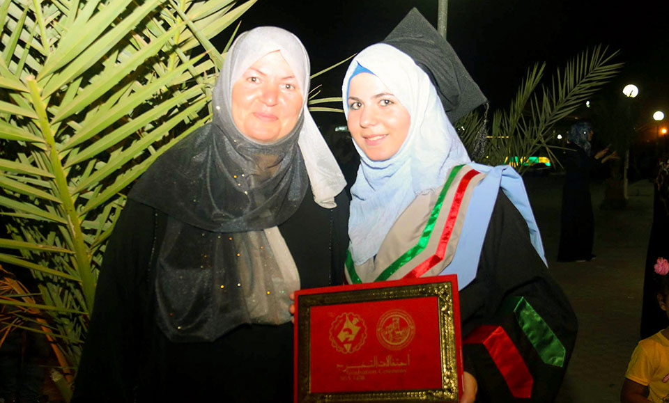 الخريجة إيمان صلاح الأغا ووالدتها الحاجة نبيلة أحمد قاسم الأغا