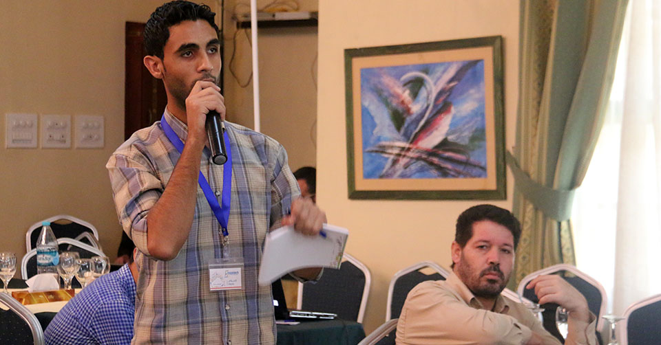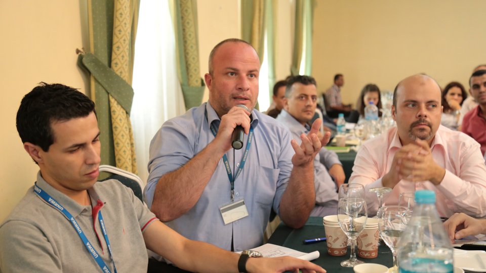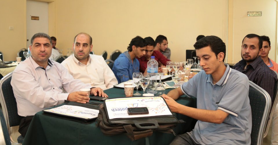 جلسة النقاش الثانية ضمن "اكسبوتك 2015" يدير الجلسة المهندس: عماد كحيل. المتحدثين: المهندس تيسير شقليه "ممثل عن مؤسسة الميرسي كور"، المهندس طارق شتات " ممثل عن مؤسسة UNDP"، المهندس رأفت أبوشعبان " ممثل عن مؤسسة التعاون"،المهندس ابراهيم الجيور" ممثل عن مؤسسة UNRWA"