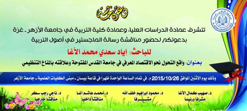 الرئيسة/رسالة ماجستير/دعوة لحضور نقاش رسالة ماجستير للباحث إياد سعدي الأغا رسالة ماجستير دعوة لحضور نقاش رسالة ماجستير للباحث إياد سعدي الأغا تاريخ النشر : الأربعاء | 21-10-2015 | 14:41 6698 اضغط هنا للتواصل أو التعرف على الأستاذ إياد سعدي محمد أسعد بدوي أحمد إبراهيم(بدوي) الأغا يمكنك تلقي أحدث الأخبار أول بأول بانضمامك لإحدى مجموعات الواتساب الخاصة بالعائلة من خلال الضغط هنـا اظهر المزيد