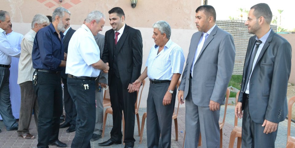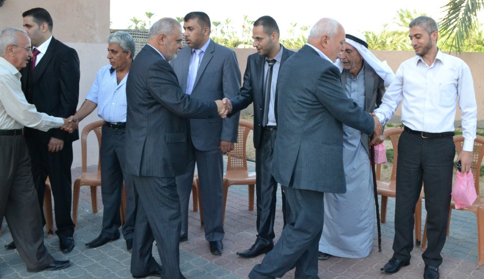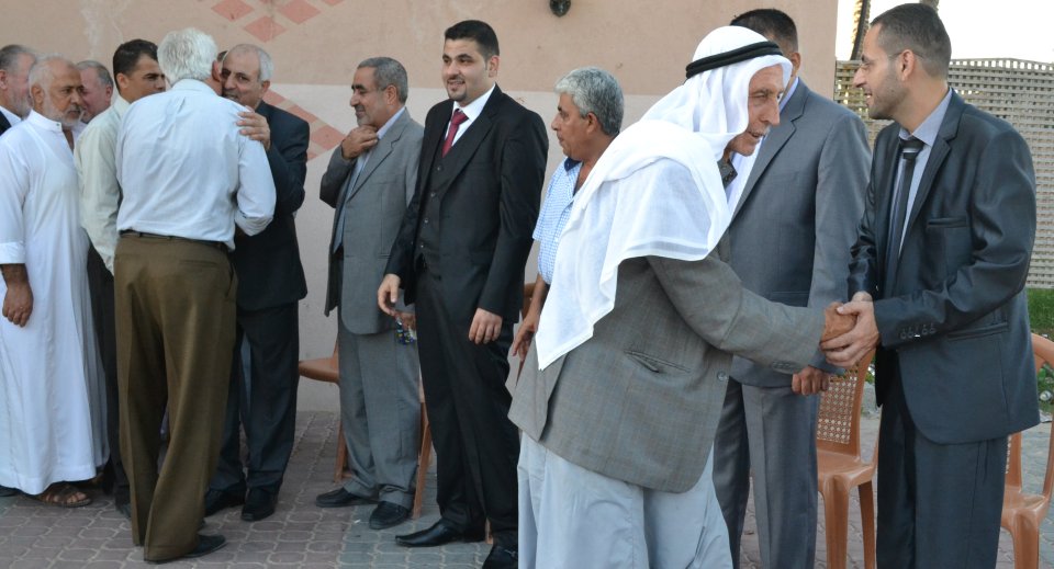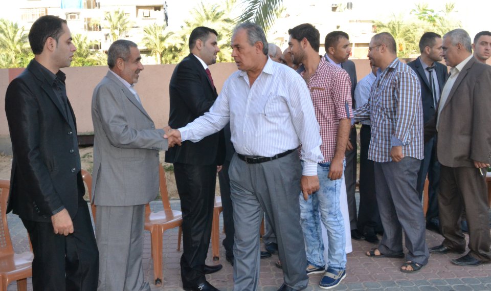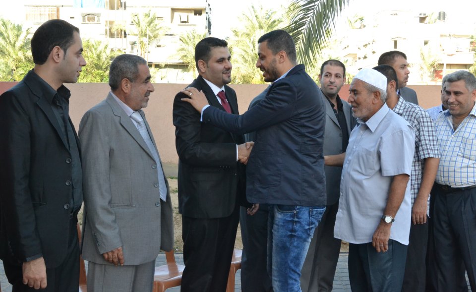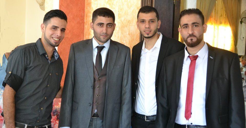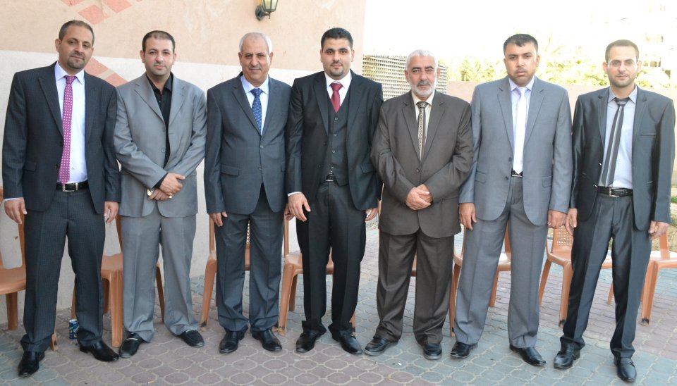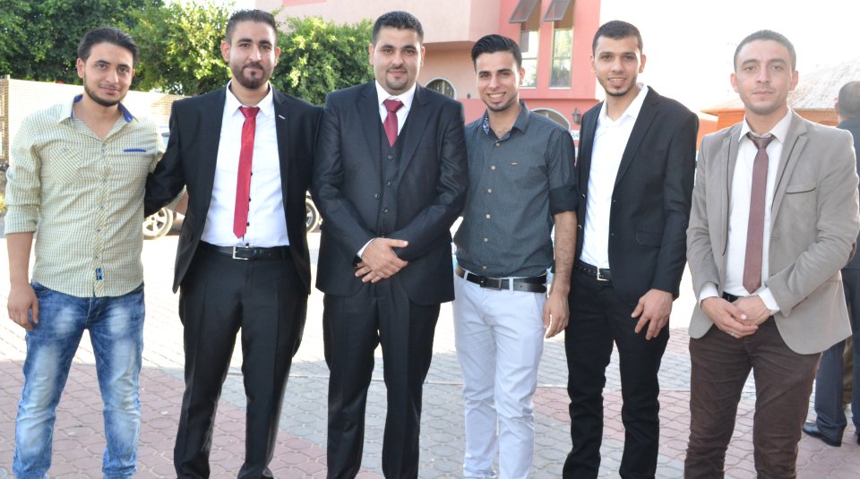 أ. علاء محمد السقا (شقيق العريس)، أ. باهر الأغا (زوج شقيقة العريس)، والد العروس، العريس، والد العريس، أ. عنان، م. عصام (أشقاء العريس)