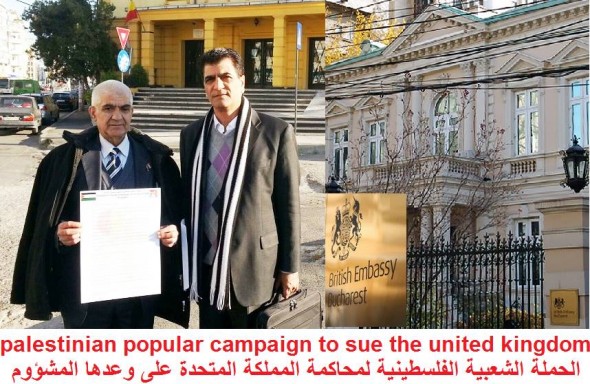 قام الدكتور وسام الأغا يرافقه الفنان جمال النجار والدكتور بشارالقيشاوي اليوم بتسليم السفارة البريطانية في العاصمة الرومانية بوخارست رسالة ومذكرة احتجاج للحكومة البريطانية على وعد بلفورالمشؤوم، تطالبها بالاعتذار للشعب الفلسطيني عن المأساة التي سببها هذا الوعد والاعتراف بدولة فلسطينية مستقلة كاملة العضوية، وما ضاع حق وراءه مطالب.