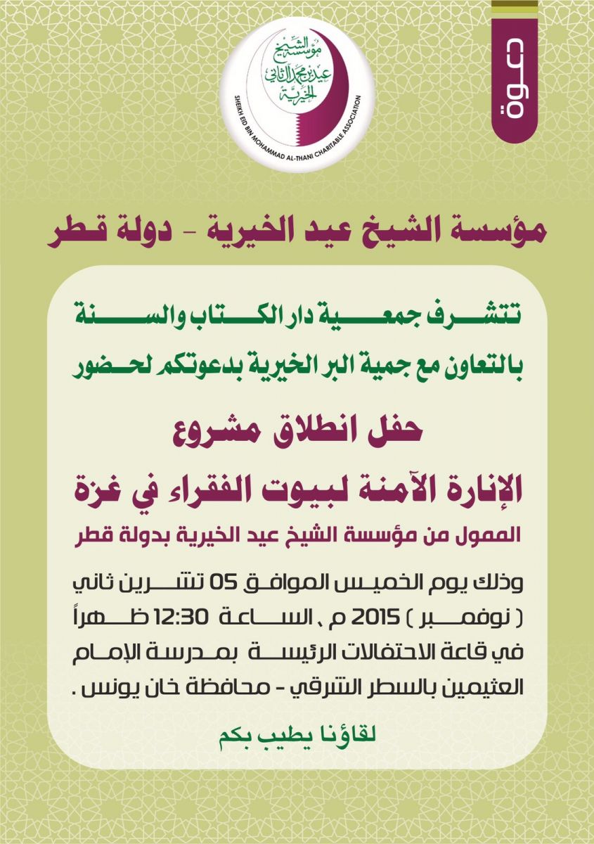غزة - احتفلت مؤسسة الشيخ عيد الخيرية بانطلاق مشروع الإنارة الآمنة لبيوت غزة، وذلك خلال احتفال نظمه شركائها في قطاع غزة جمعية دار الكتاب والسنة والبر الخيرية، حضره لفيف من المسؤولين الحكوميين الفلسطينيين وممثلي المؤسسات الأهلية وعشرات المستفيدين من المشروع.