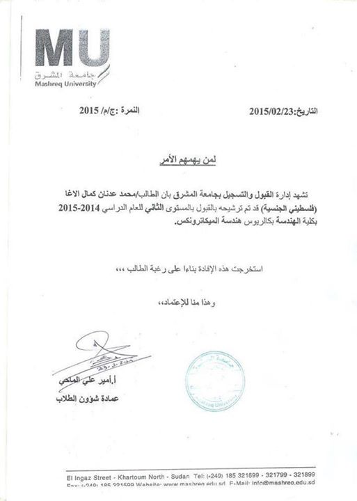 غادر أرض الوطن بحفظ الله ورعايته الطالب محمد عدنان كمال الأغا عبر معبر إيرز متوجهاً إلى دولة السودان لإستكمال