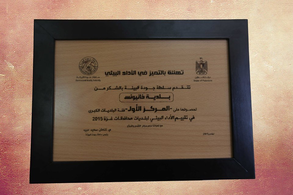 وأعلنت سلطة جودة البيئة فوز بلدية خان يونس بالمركز الأول مناصفةً مع نظيرتها غزة وذلك خلال حفل نظمته برعاية شركة الاتصالات الخلوية "جوال" في فندق المتحف شمال غرب مدينة غزة، لإعلان نتائج التقييم للبلديات الكبرى والمتوسطة لعام 2015.