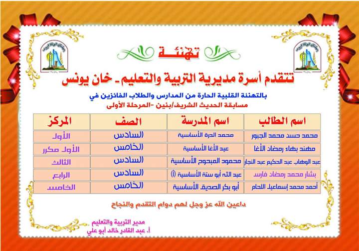 الرئيسة/متفرقات/حصول الطالب مهند بهاء رمضان الاغا على المركز الاول في مسابقة الحديث متفرقات حصول الطالب مهند بهاء رمضان الاغا على المركز الاول في مسابقة الحديث تاريخ النشر : الأربعاء | 25-11-2015 | 07:29 5504 حصول الطالب مهند بهاء رمضان الاغا من مدرسة عيد الأغا الأساسية على المركز الاول في مسابقة الحديث، وألف مبارك اضغط هنا للتواصل أو التعرف على الشاب مهند بهاء رمضان صالح عثمان الأغا يمكنك تلقي أحدث الأخبار أول بأول بانضمامك لإحدى مجموعات الواتساب الخاصة بالعائلة من خلال الضغط هنـا اظهر المزيد