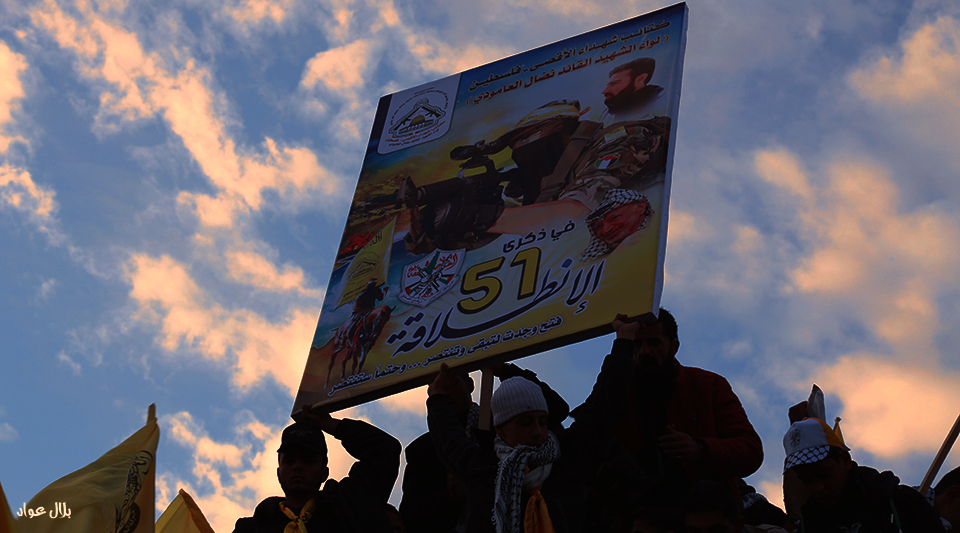 في هذا العرس الوطني ونحن نوقد شعلة الانطلاقة نهنئ جماهير شعبنا في الوطن والشتات شعب الانتفاضة العظيم من الشبل والطفل الى الشيخ والزهرة والى الجرحى وامهات الشهداء والاسرى ببداية العام الجديد واعياد الميلاد المجيدة وبدخول فتحنا عامها الحادي والخمسين ونعاهدكم ان نبقى الاوفياء والامناء واننا على العهد باقون وعلى الدرب ماضون وان شاء الله نحيي هذه الذكرى في عامنا القادم في ربوع دولتنا الفلسطينية المستقلة .