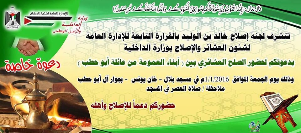 عقدت لجنة اصلاح خالد بن الوليد مساء الجمعة 01-01-2016 فى مسجد بلال بمعسكر خانيونس صلح عشائرى بين أبناء العمومه من ال أبو حطب(القبيبة) وحضر الصلح كلا من الدكتور يوسف الاسطل والدكتور يونس الاسطل النائب بالمجلس التشريعى والدكتور صلاح البردويل النائب بالمجلس التشريعى والدكتور يحيى موسى عضو المجلس التشريعى والدكتور وليد عامر والشيخ صلاح سلطان والشيخ سليمان الرومى والدكتور جميل مطاوع والعديد من الشخصيات والوجهاء والمخاتير وكبار عائله ابوحطب.