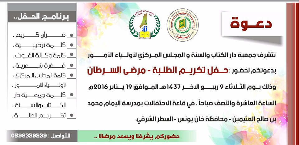 الرئيسة/متفرقات/دعوة لحضور حفل تكريم الطلبة- مرضى السرطان متفرقات دعوة لحضور حفل تكريم الطلبة- مرضى السرطان تاريخ النشر : الإثنين | 18-01-2016 | 12:02 8033 يمكنك تلقي أحدث الأخبار أول بأول بانضمامك لإحدى مجموعات الواتساب الخاصة بالعائلة من خلال الضغط هنـا اظهر المزيد