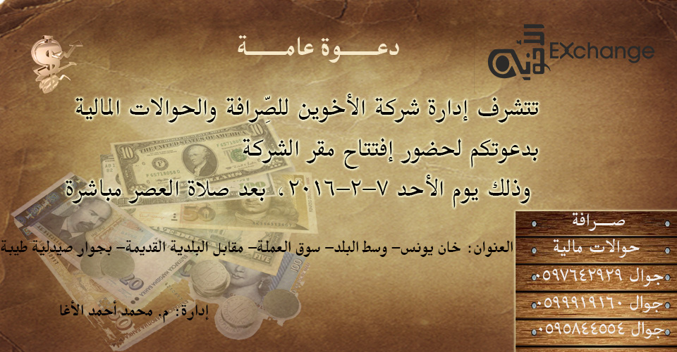 الرئيسة/بيع وشراء/دعوة عامة لحضور إفتتاح شركة الأخوين للصرافة بيع وشراء دعوة عامة لحضور إفتتاح شركة الأخوين للصرافة تاريخ النشر : الجمعة | 05-02-2016 | 10:14 10434 اضغط هنا للتواصل أو التعرف على المهندس محمد أحمد يوسف الأغا يمكنك تلقي أحدث الأخبار أول بأول بانضمامك لإحدى مجموعات الواتساب الخاصة بالعائلة من خلال الضغط هنـا اظهر المزيد