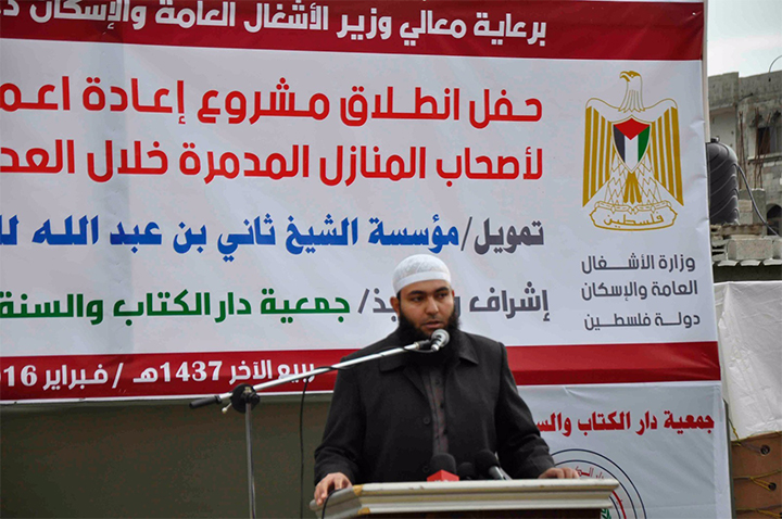 غزة- احتفلت مؤسسة الشيخ ثاني بن عبد الله للخدمات الإنسانية "راف"، بانطلاق مشروع إعادة إعمار بيوت أهل غزة، للمهدمة بيوتهم كلياً خلال العدوان الأخير، وذلك عبر شركائها بغزة جمعية دار الكتاب والسنة، وبحضور محافظ محافظة خان يونس د.أحمد الشيبي ممثلاً عن الرئاسة، ووزير الأشغال العامة والإسكان د.م.مفيد الحساينة ممثلاً الحكومة الفلسطينية، ولفيف من رؤساء البلديات وممثلي المؤسسات الرسمية والأهلية وجمع من الفلسطينيين.