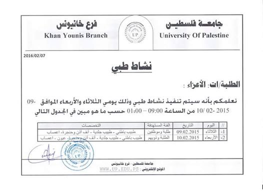 نفذت جامعة فلسطين فرع خان يونس نشاطاً طبياً، بالتعاون مع الهلال الأحمر الفلسطيني، حيث تم من خلاله علاج طلبة الجامعة، والموظفين والأكاديمين العاملين بالجامعة، وذلك من خلال توجيهات ادارتها المتميزة الداعمة لكل القضايا الوطنية والمجتمعية.