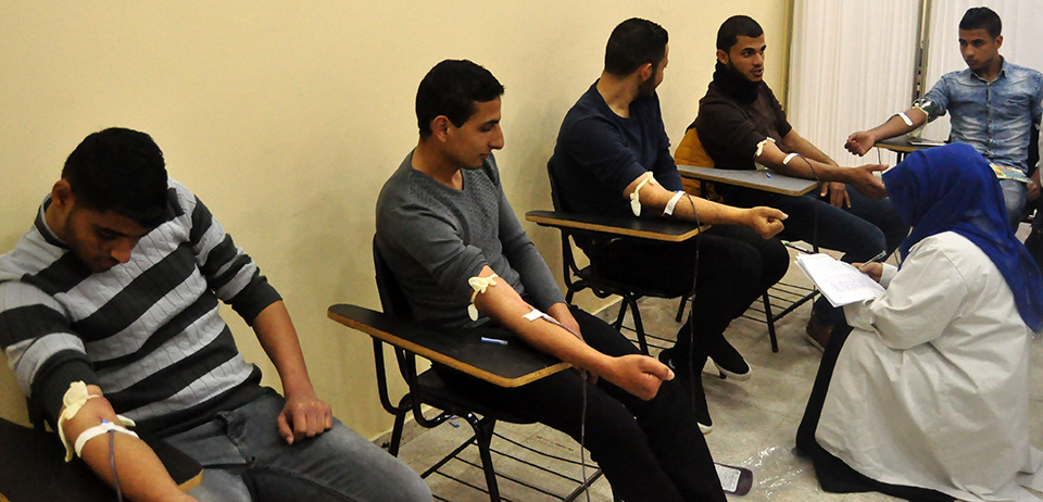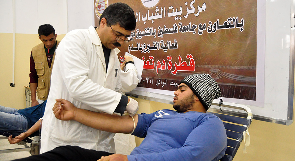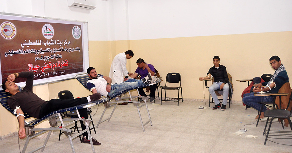خان يونس/ السطر الشرقي/ جامعة فلسطين 20-02-2016- نظم مركز بيت الشباب الفلسطيني مبادرة للتبرع بالدم، بالتعاون مع جامعة فلسطين، وبالتنسيق مع جمعية بنك الدم.وهذه المبادرة ضمن أنشطة مركز بيت الشباب الفلسطيني ونظراً للحاجة الماسة للمرضى والحالات الخاصة، منها غسيل الكلى والثلاسيميا.