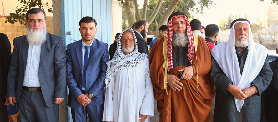 المختار ابو العبد المجايدة(جد العريس)، د.رياض الاسطل (والد العريس)، الشيخ ابراهيم الاسطل، العريس، الحاج طاهر الاسطل(جد العروسين)،